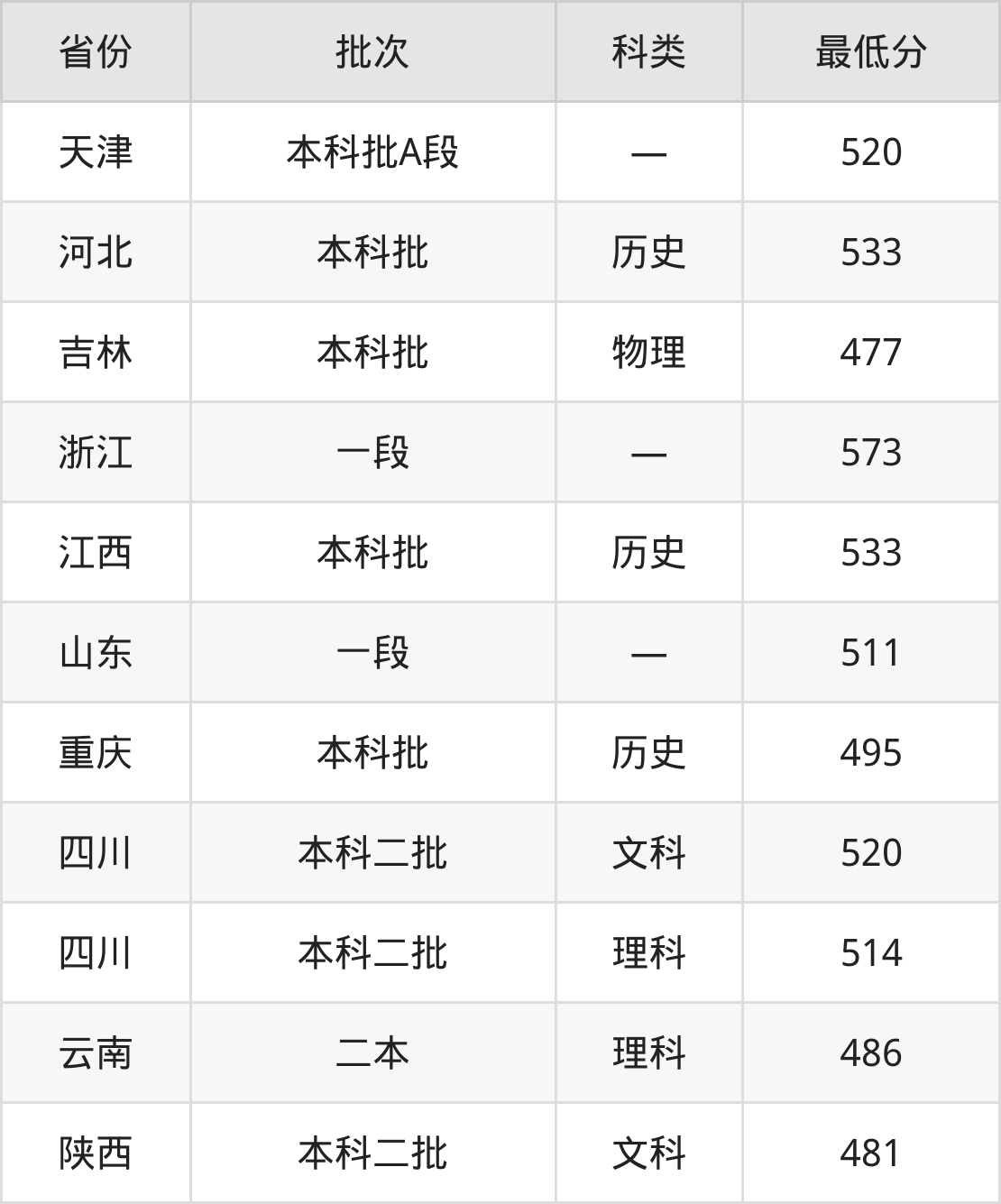 广西财经学院金融学专业在全国各省最低录取分数线为477分(吉林物理类),除此之外,在其余地区的最低分为重庆历史类495分、四川理科514分、云南理科486分、陕西文科481分等,以上数据均为2024年数据,供2025年高考生参考。
