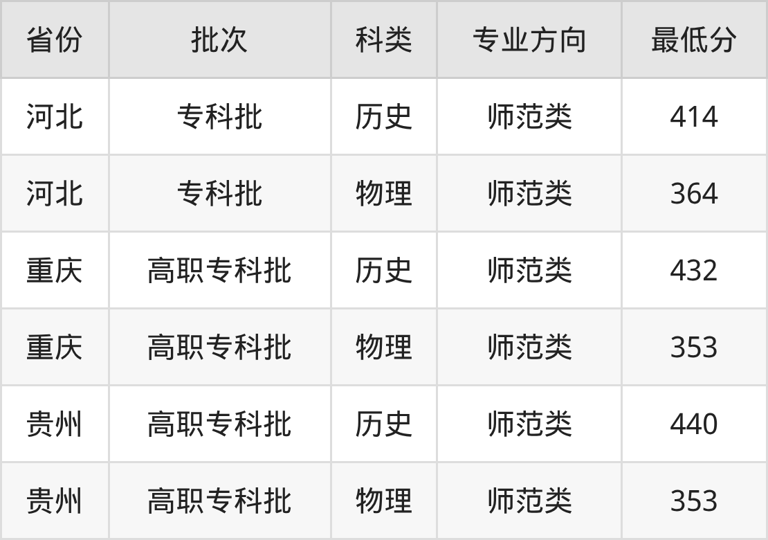 广西幼儿师范高等专科学校特殊教育专业录取分数线从353分到440分不等,最低分数线如下: