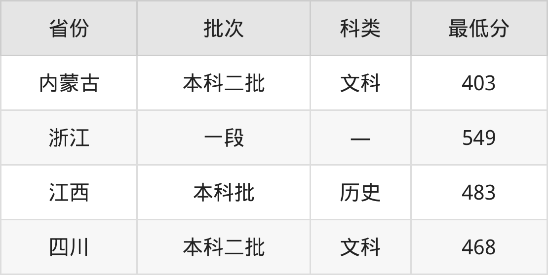 广州应用科技学院法学专业在全国各省最低录取分数线为403分(内蒙古文科),除此之外,在其余地区的最低分为四川文科468分、浙江549分、江西历史类483分,以上数据均为2024年数据,供2025年高考生参考。