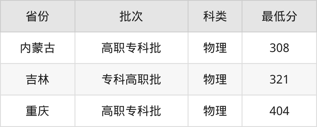 武汉交通职业学院邮政快递智能技术专业在全国各省最低录取分数线为308分(内蒙古物理类),除此之外,在其余地区的最低分为吉林物理类321分、重庆物理类404分,以上数据均为2025年数据,供2026年高考生参考。