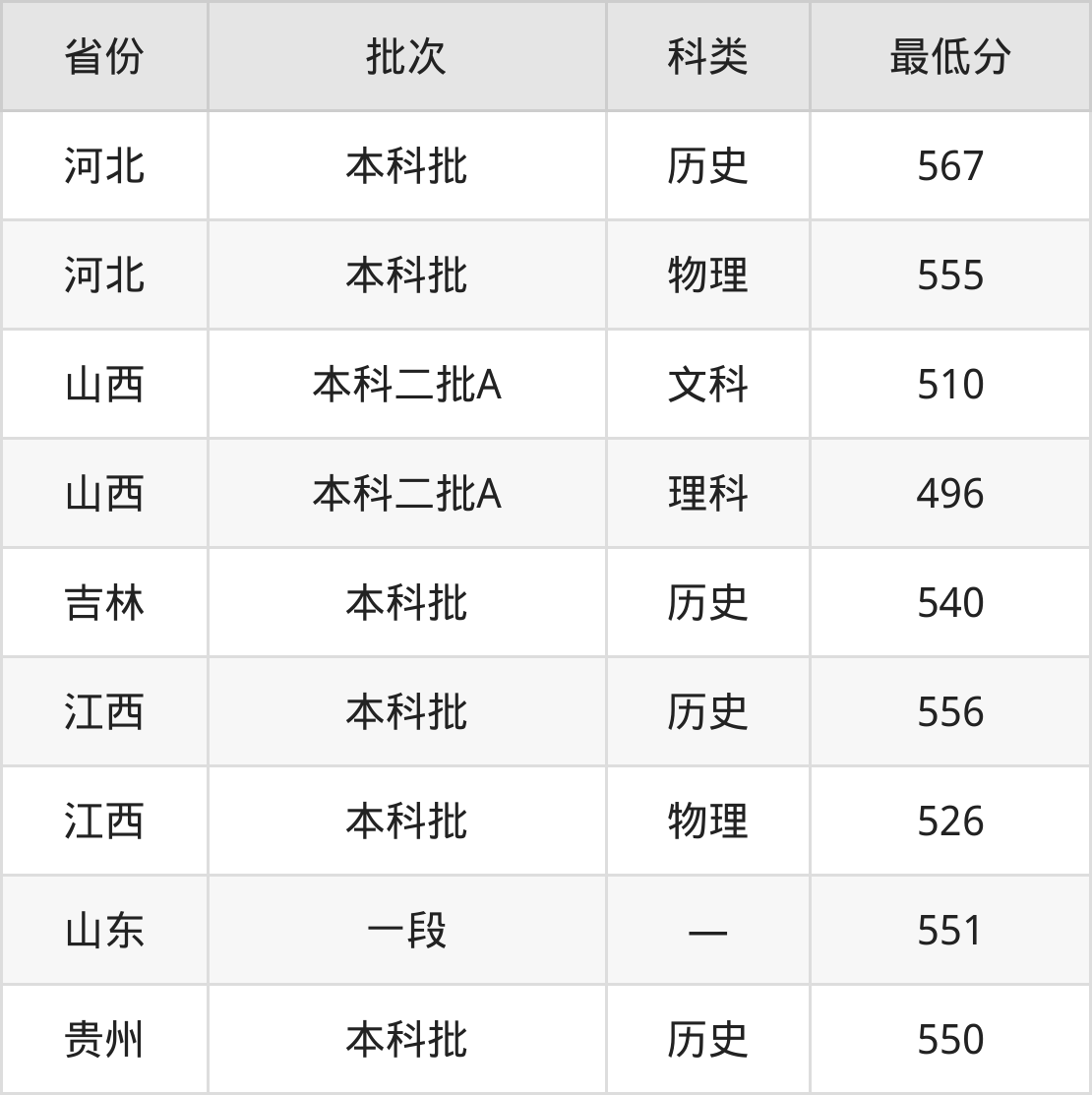 华东交通大学英语专业在全国各省最低录取分数线为496分(山西理科),除此之外,在其余地区的最低分为吉林历史类540分、江西物理类526分、山东551分、贵州历史类550分等,以上数据均为2024年数据,供2025年高考生参考。