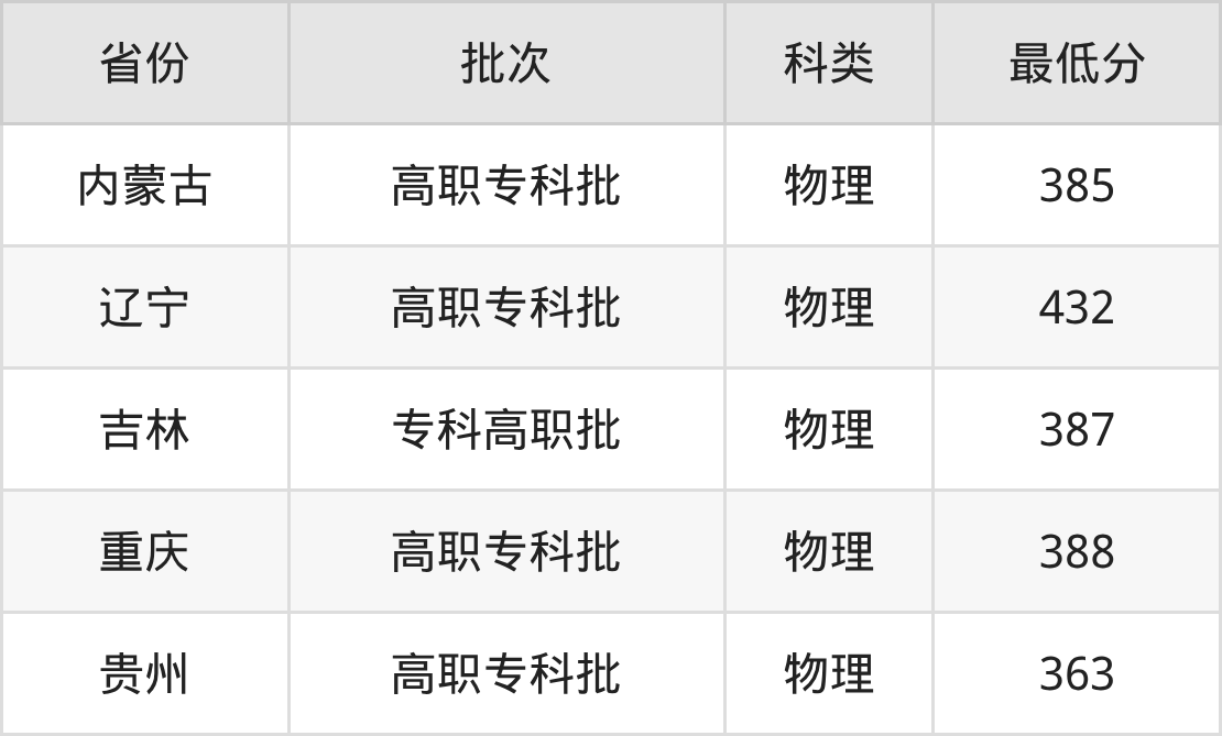 辽宁铁道职业技术学院无人机测绘技术专业在全国各省最低录取分数线为363分(贵州物理类),除此之外,在其余地区的最低分为内蒙古物理类385分、辽宁物理类432分、吉林物理类387分、重庆物理类388分,以上数据均为2025年数据,供2026年高考生参考。