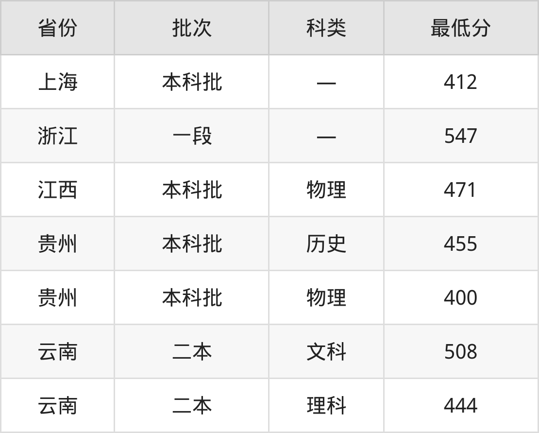 上海财经大学浙江学院工商管理专业在全国各省最低录取分数线为400分(贵州物理类),除此之外,在其余地区的最低分为浙江547分、江西物理类471分、云南理科444分、上海412分,以上数据均为2024年数据,供2025年高考生参考。