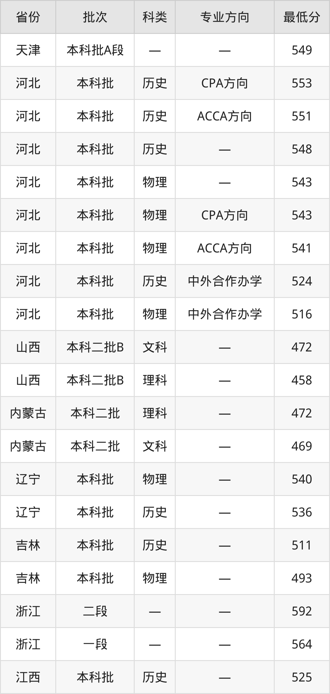 河北金融学院会计学专业在全国各省录取分数线: