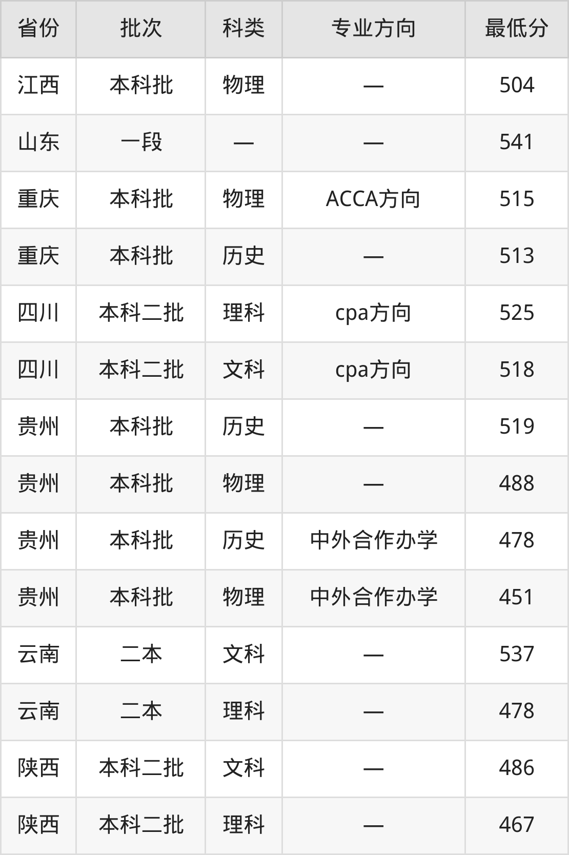 河北金融学院会计学专业在全国各省最低录取分数线为451分(贵州物理类),除此之外,在其余地区的最低分为重庆历史类513分、浙江564分、四川文科518分、云南理科478分等,以上数据均为2024年数据,供2025年高考生参考。