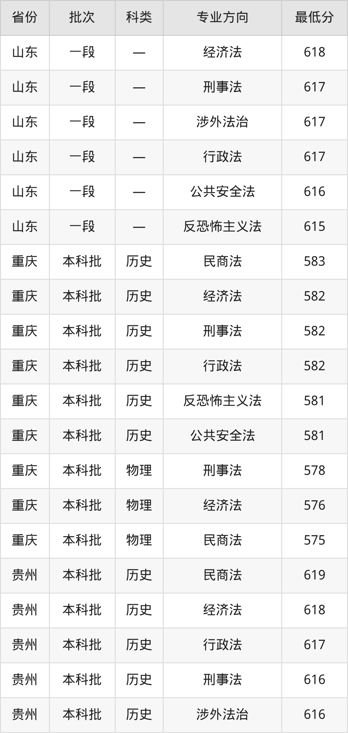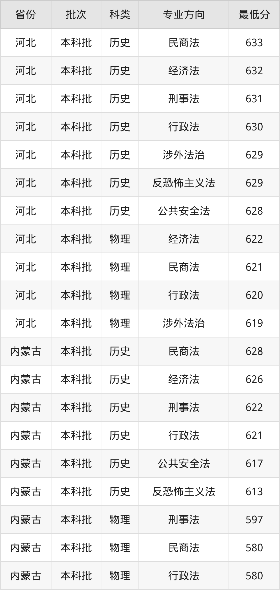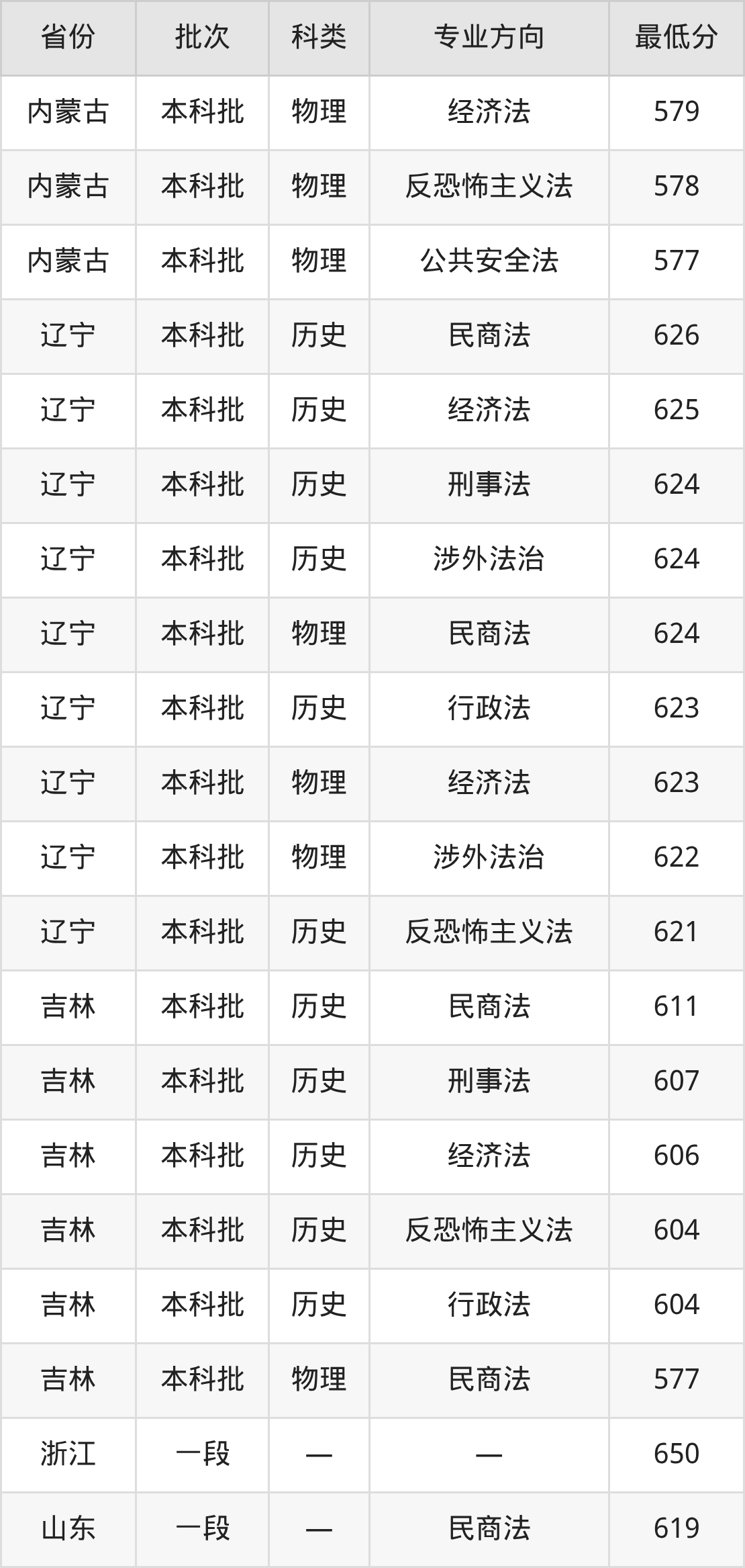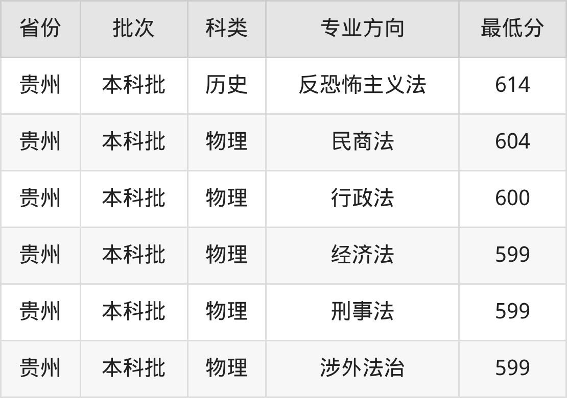 西北政法大学法学专业录取分数线从575分到654分不等,最低分数线如下: