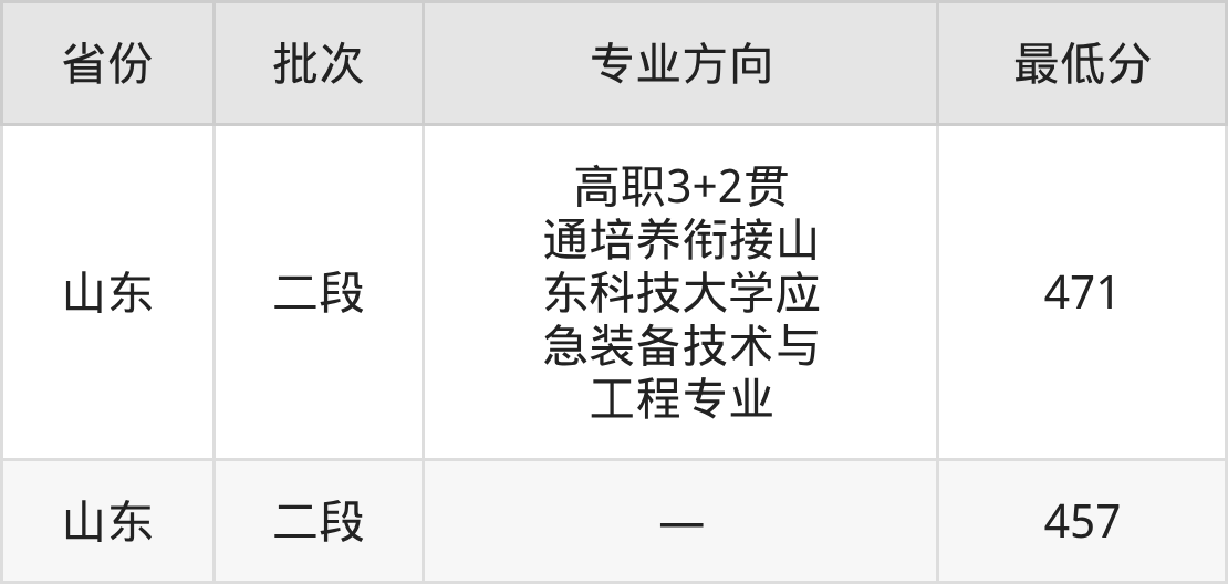 山东职业学院机械制造及自动化专业录取分数线从457分到471分不等,最低分数线如下: