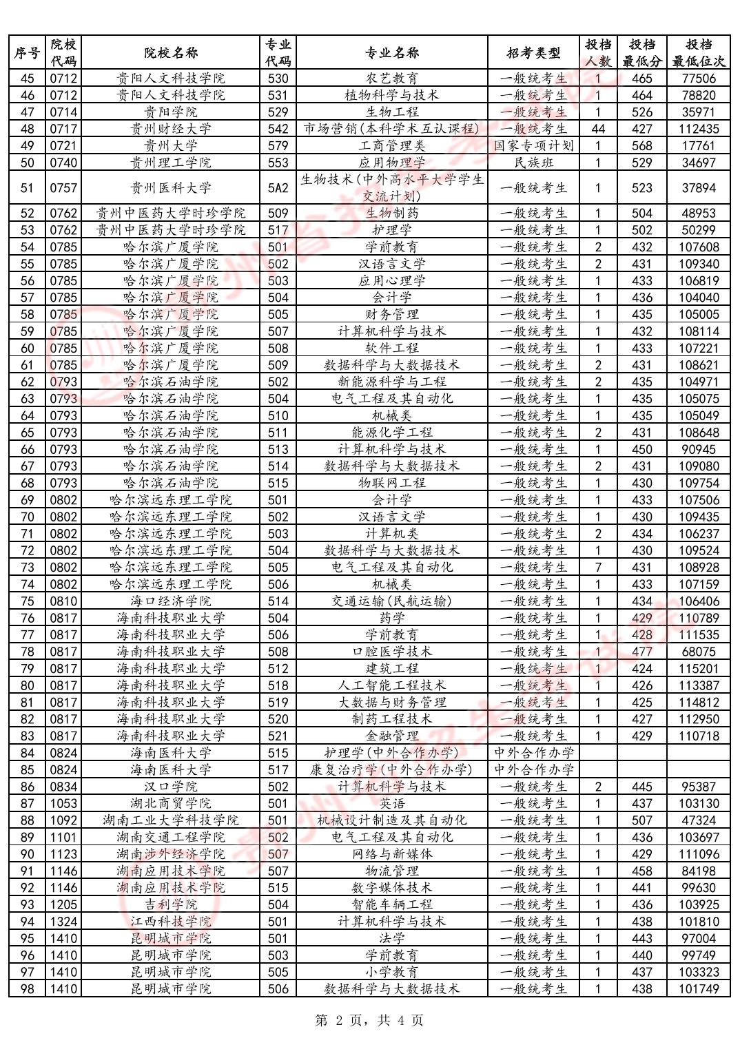 贵州本科批第2次征集志愿学校名单及分数线如下图