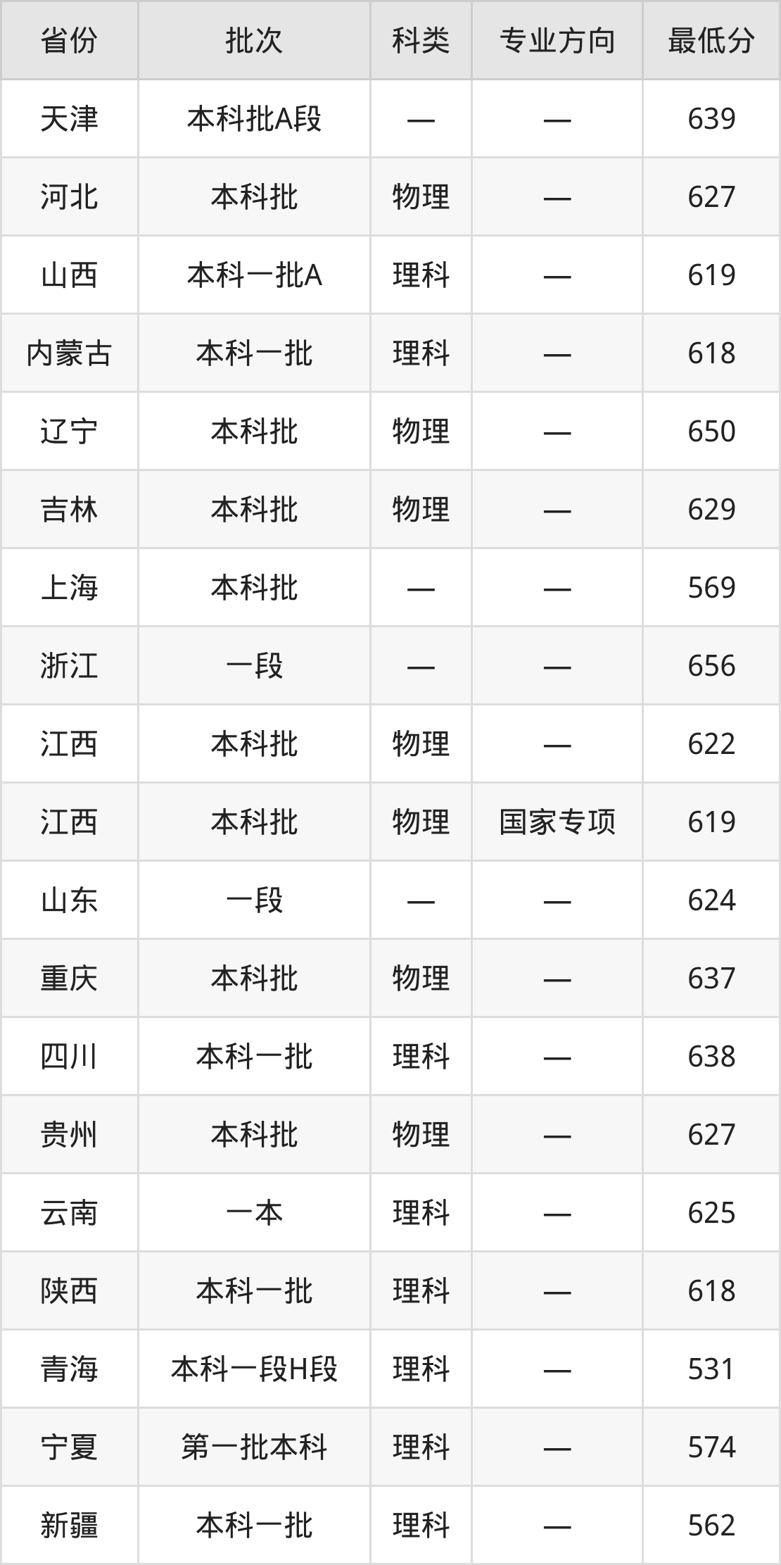 南京航空航天大学电子信息类专业录取分数线从531分到656分不等,在部分地区的最低分数线如下: