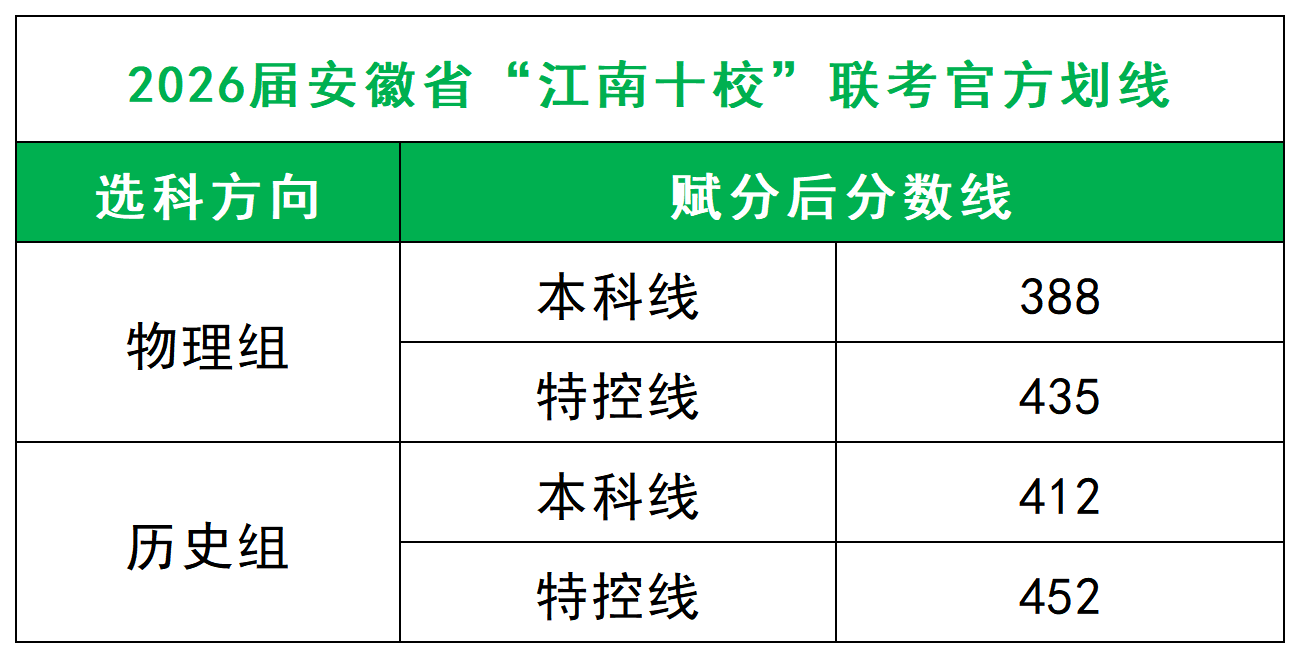 2026年安徽省“江南十校”一模考试分数线已于2026年3月15日正式公布。本次考试物理组本科线为388分、特控线为435分;历史组本科线为412分、特控线为452分。 生物原始分94分能赋到100分, 化学原始分68分能赋到92分等。