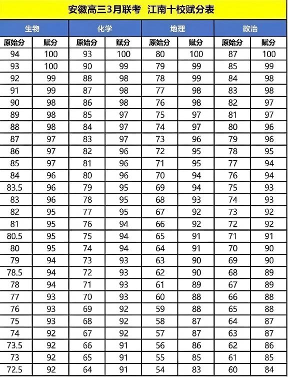 下面是安徽省江南十校物理组前20名原始分对应赋分表: