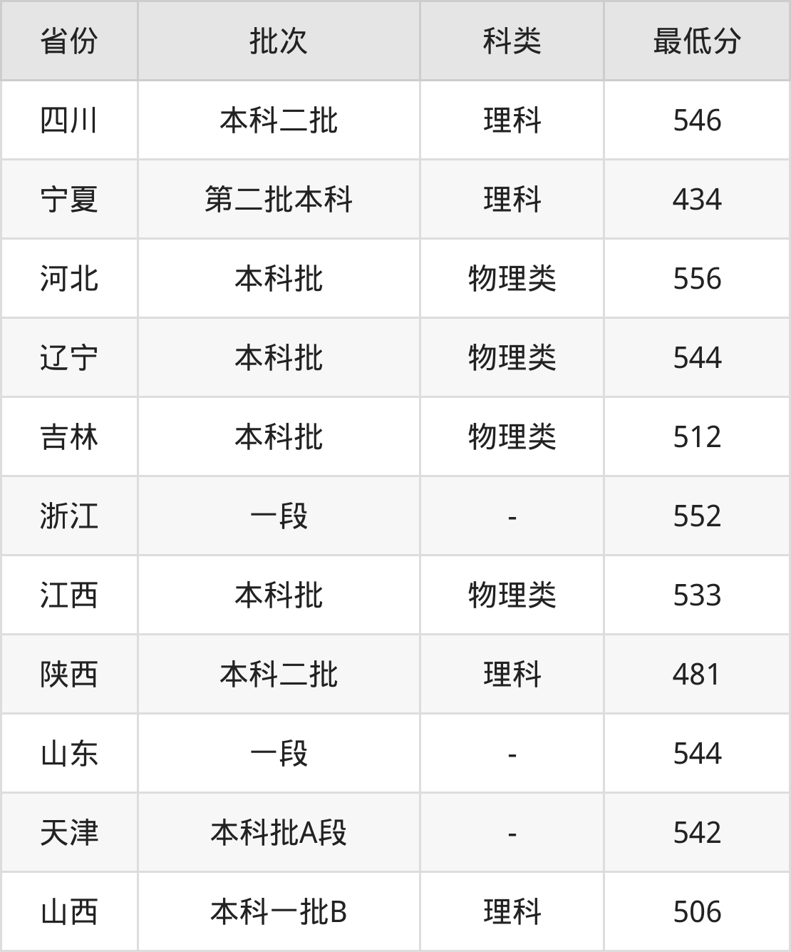 | 批次 | 科类 | 最低分 | 位次 |