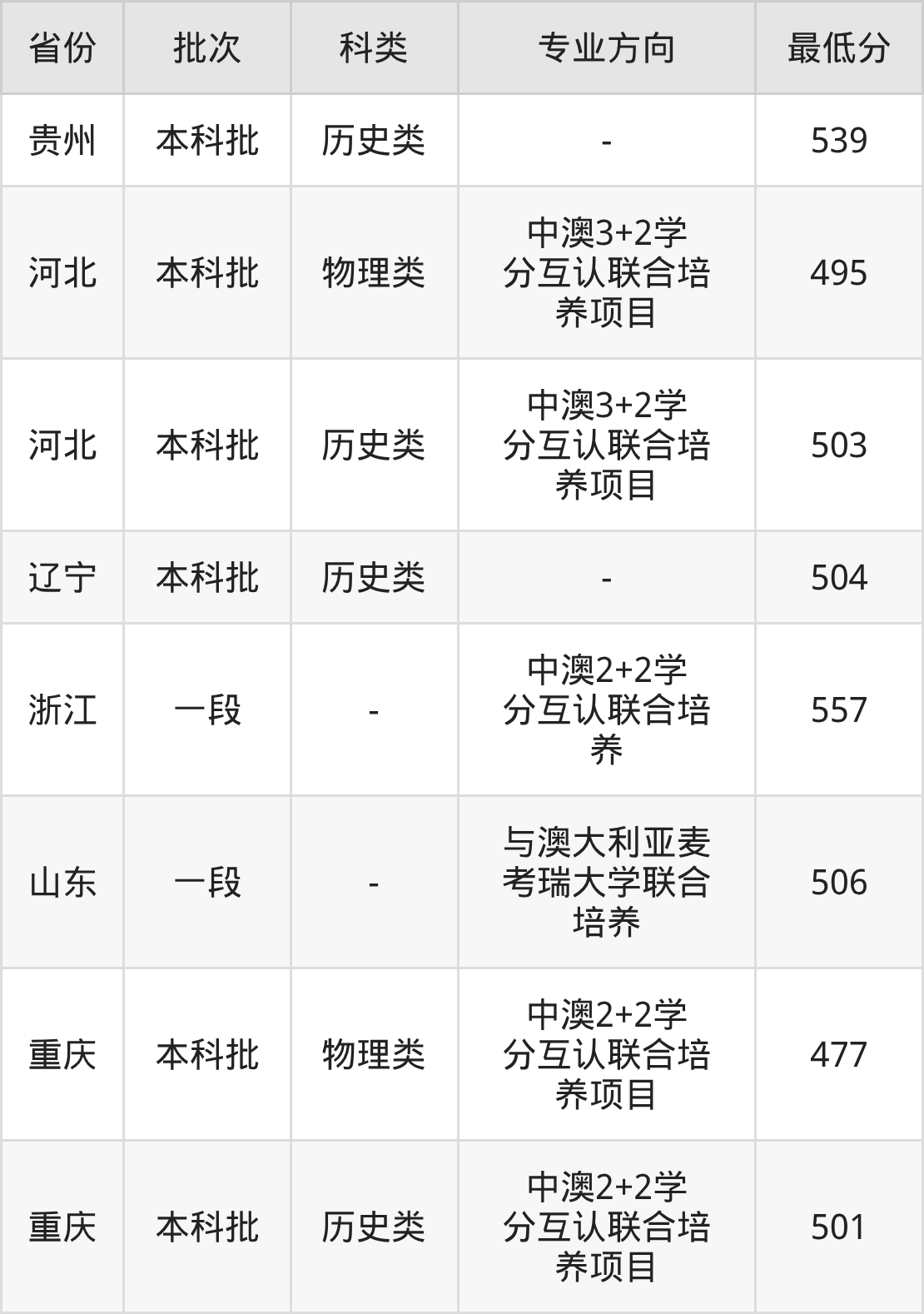 物理类495分(中澳3+2学分互认联合培养项目、位次169008名),历史类503分(中澳3+2学分互认联合培养项目、位次47901名);