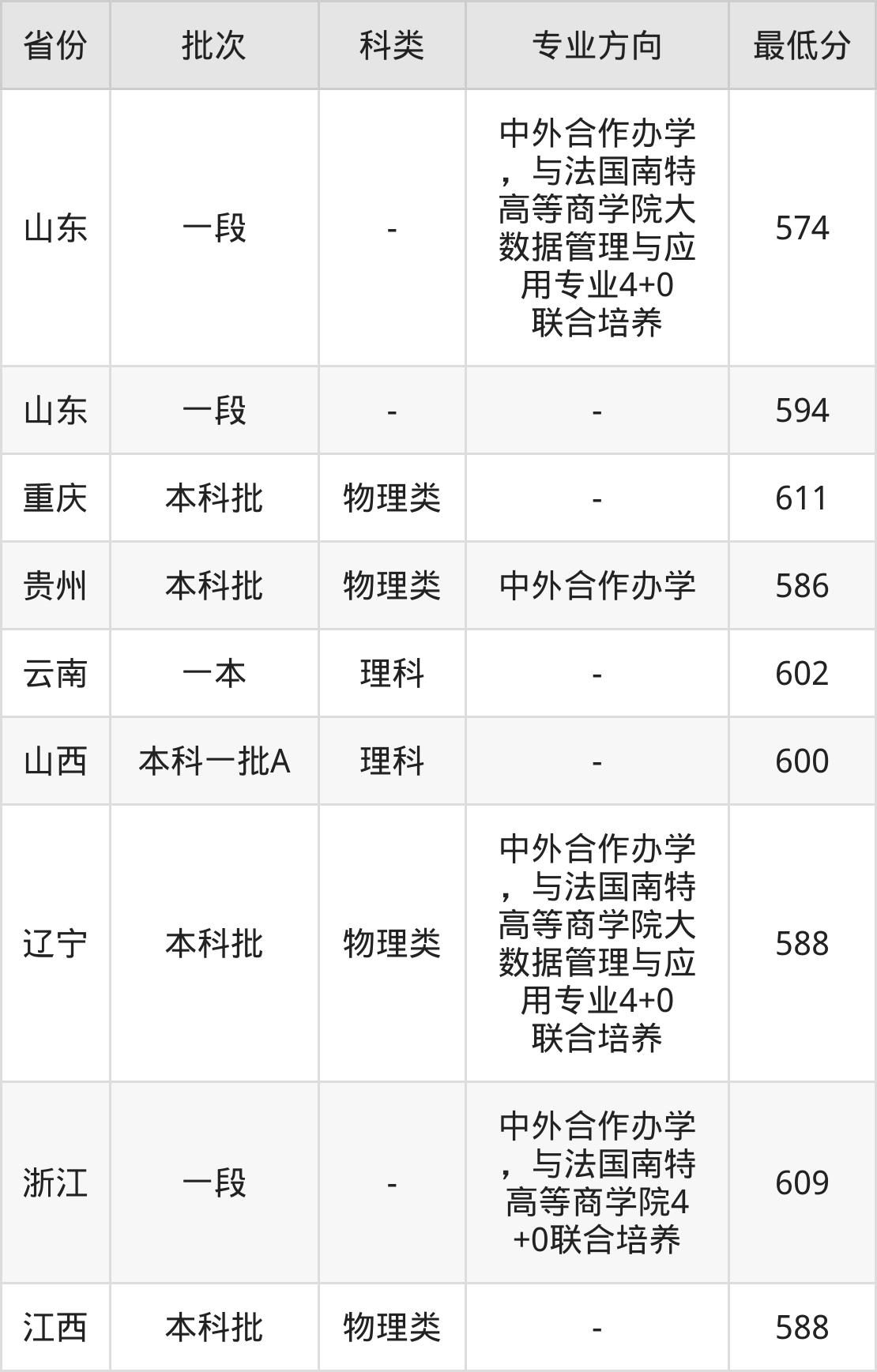 574分(中外合作办学,与法国南特高等商学院大数据管理与应用专业4+0联合培养、位次43995名),594分(位次26054名)。