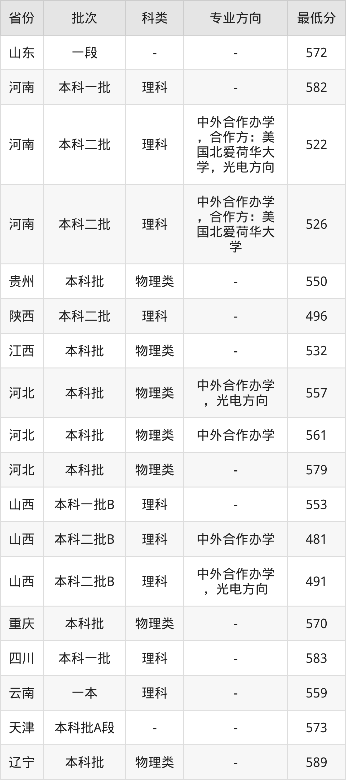 理科582分(位次37744名),理科522分(中外合作办学,合作方:美国北爱荷华大学,光电方向、位次112738名),理科526分(中外合作办学,合作方:美国北爱荷华大学、位次106610名);