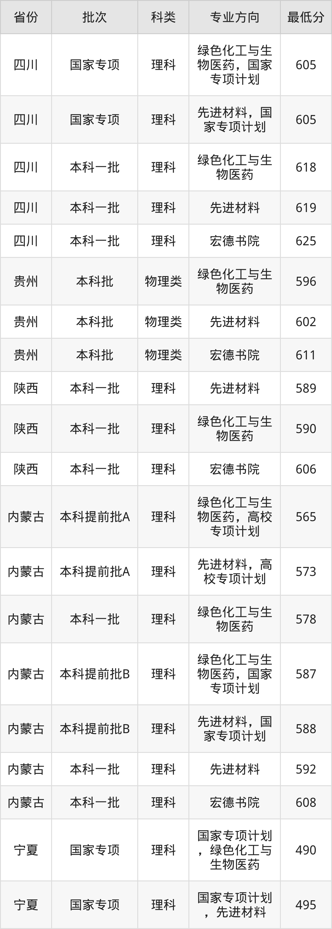 理科585分(先进材料、位次11535名),理科586分(绿色化工与生物医药、位次11250名),理科602分(先进材料、位次7199名),理科602分(绿色化工与生物医药、位次7199名),理科612分(宏德书院、位次5167名)。