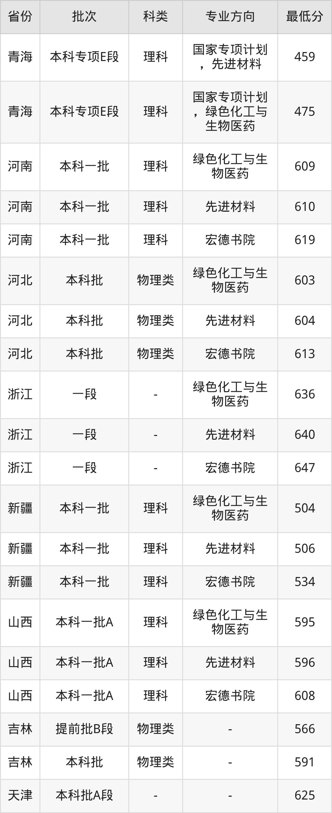 理科609分(绿色化工与生物医药、位次18059名),理科610分(先进材料、位次17519名),理科619分(宏德书院、位次13028名);