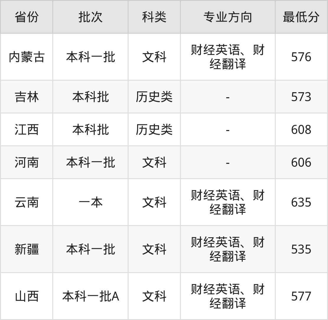 中央财经大学外国语言文学类专业录取分数线2024各省汇总显示,市外招生最低分为新疆535分、山西577分、内蒙古576分、吉林573分等。更多专业分数详情、选科要求、专业简介等均可在正文查阅。