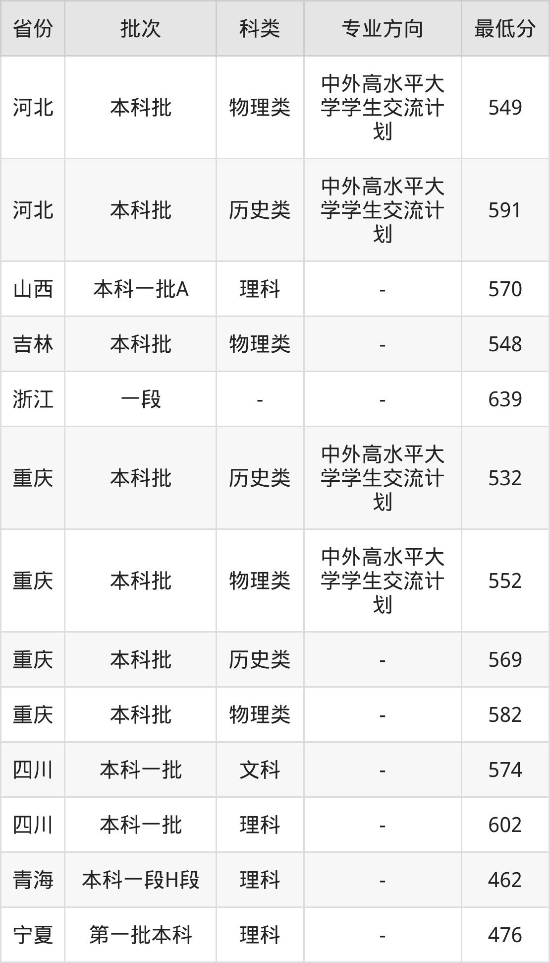 历史类532分(中外高水平大学学生交流计划、位次8846名),物理类552分(中外高水平大学学生交流计划、位次32617名),历史类569分(位次3880名),物理类582分(位次19519名)。