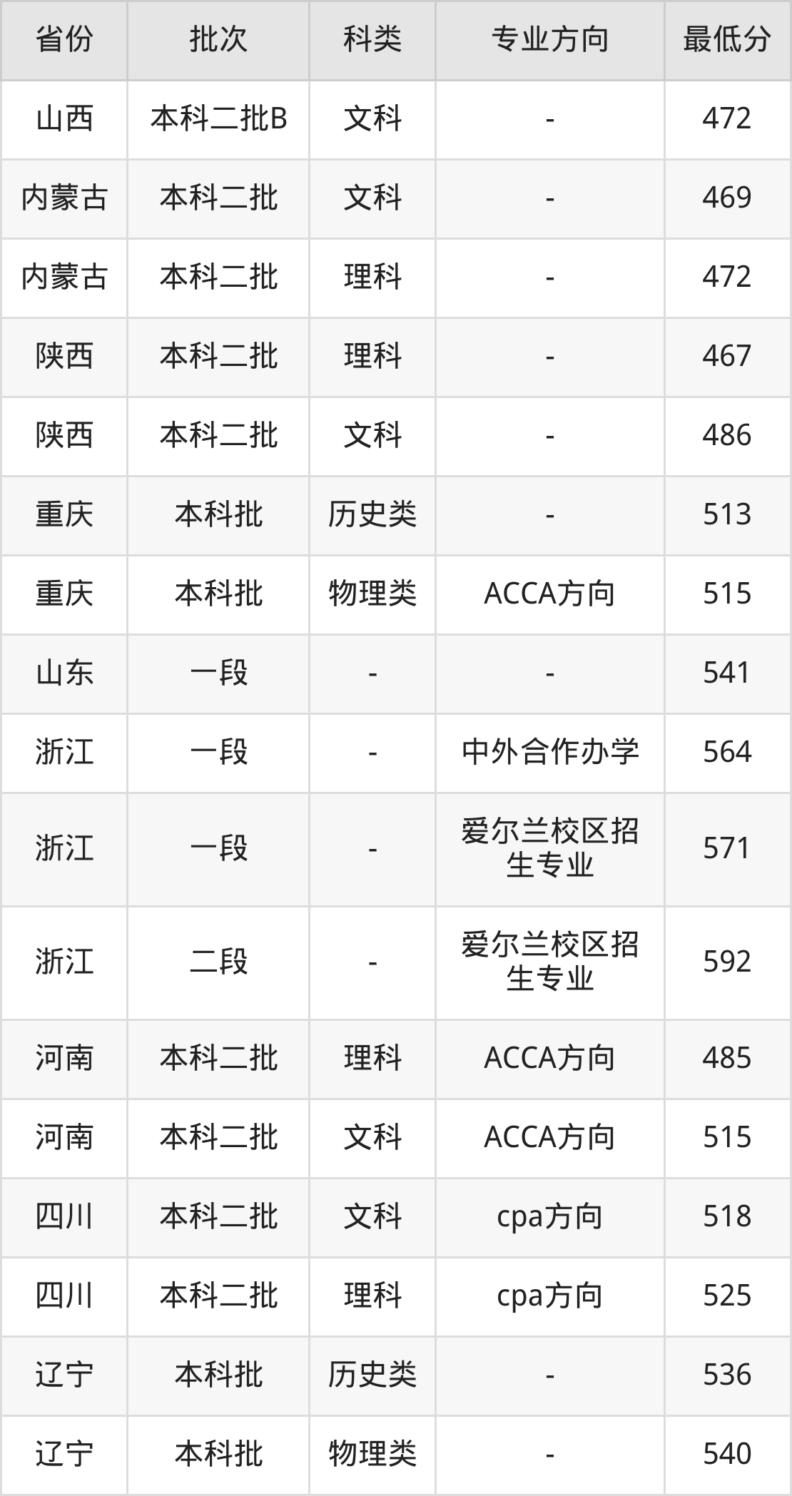 564分(中外合作办学、位次93783名),571分(爱尔兰校区招生专业、位次86560名),592分(爱尔兰校区招生专业、位次61878名);