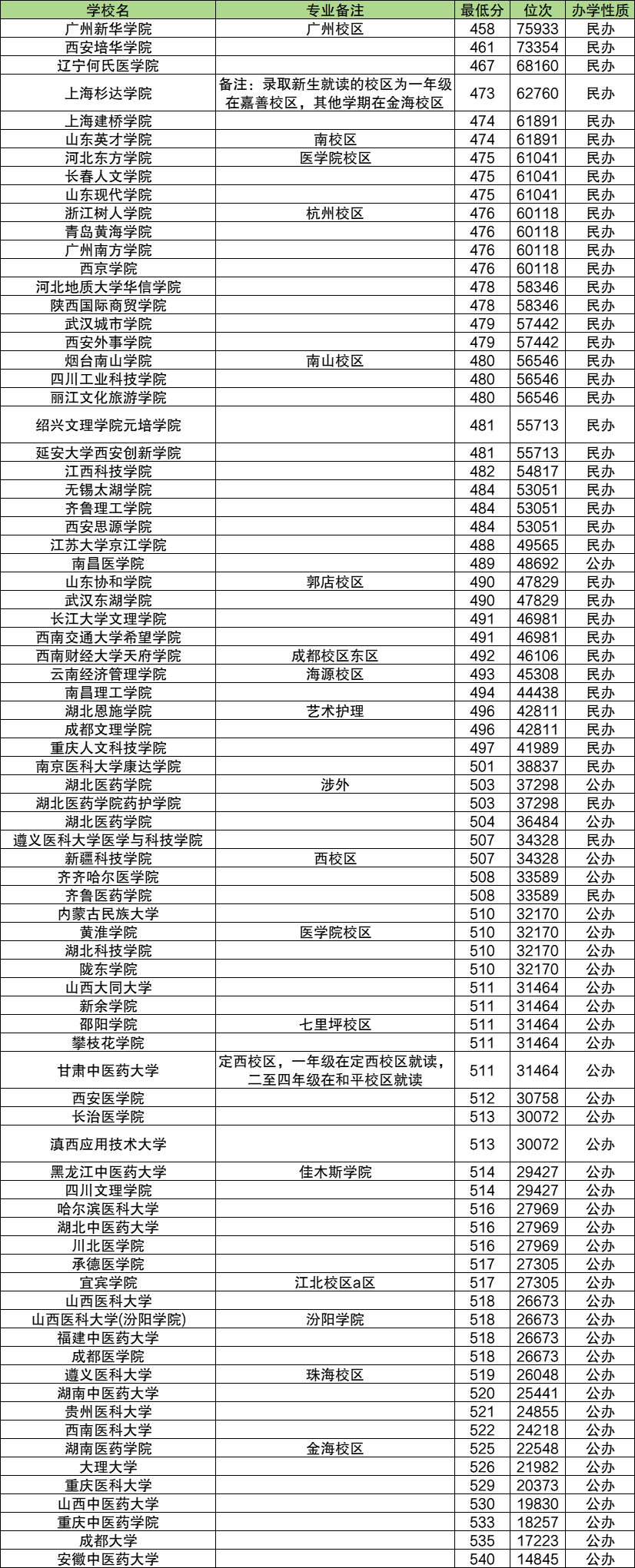 在文科二本招生的护理学大学有79所,录取分数线最低的是广州新华学院(民办),2024年最低分458分;录取分数线最高的是安徽中医药大学,2024年最低分540。最低分公办二本护理学大学为南昌医学院,2024年最低分489分。