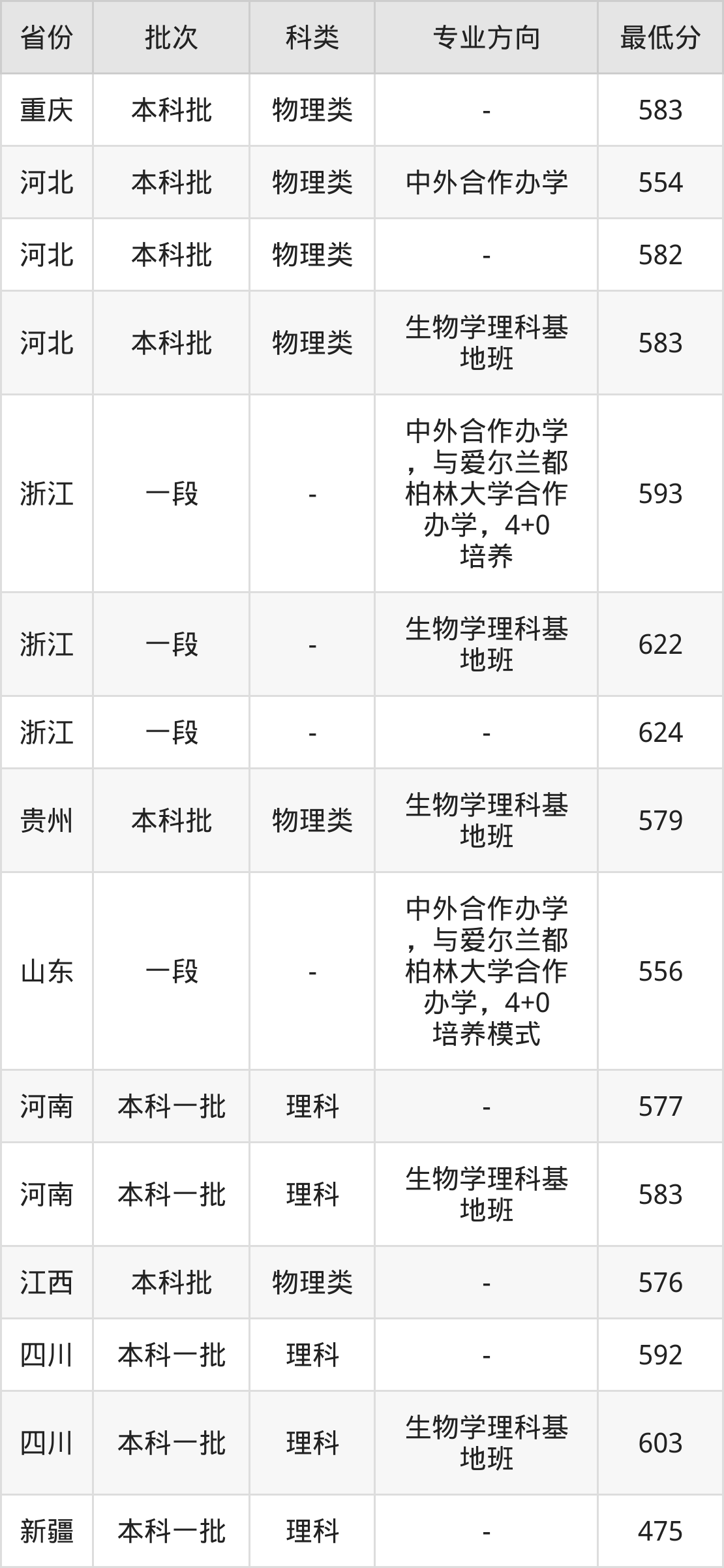 593分(中外合作办学,与爱尔兰都柏林大学合作办学,4+0培养、位次61210名),622分(生物学理科基地班、位次31719名),624分(位次29686名);