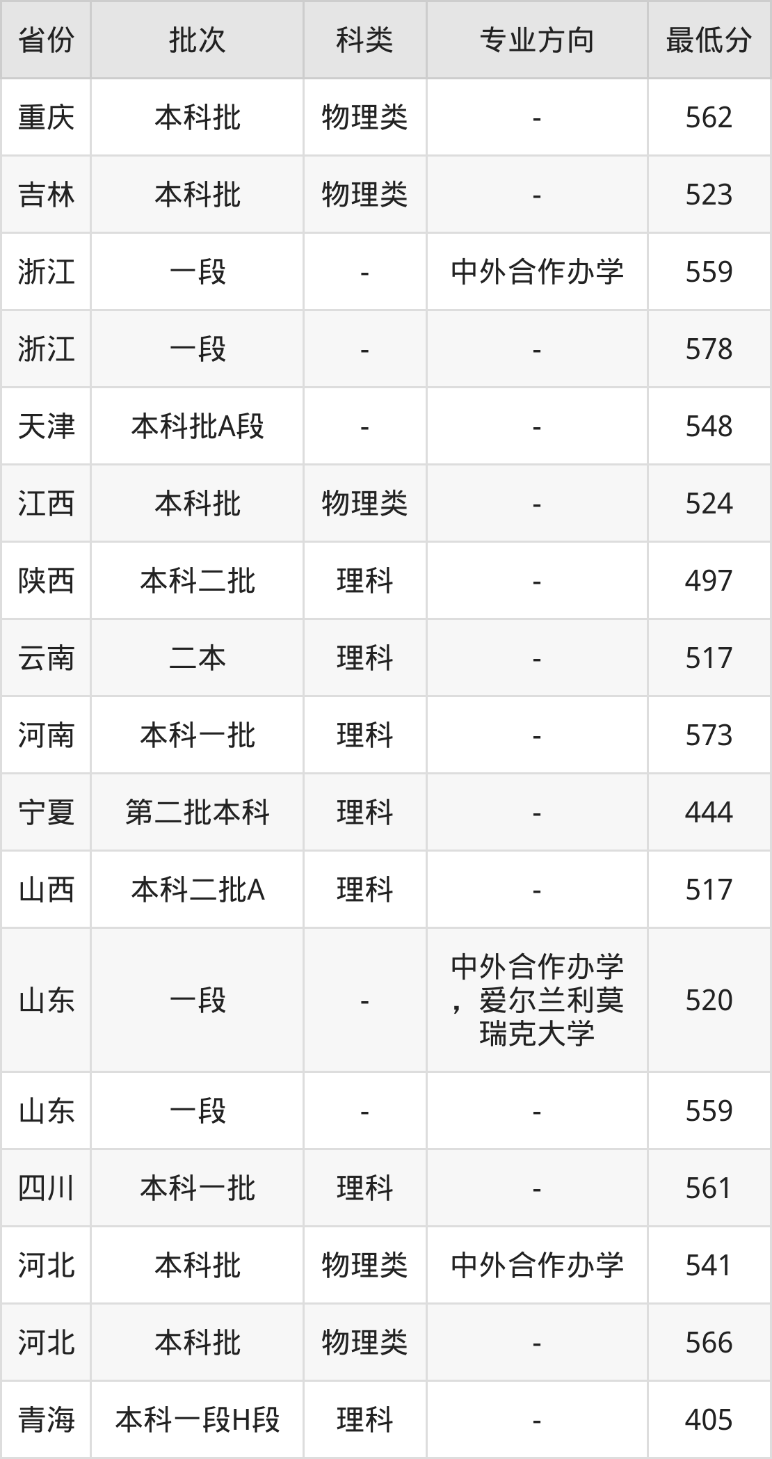 520分(中外合作办学,爱尔兰利莫瑞克大学、位次131838名),559分(位次63142名);