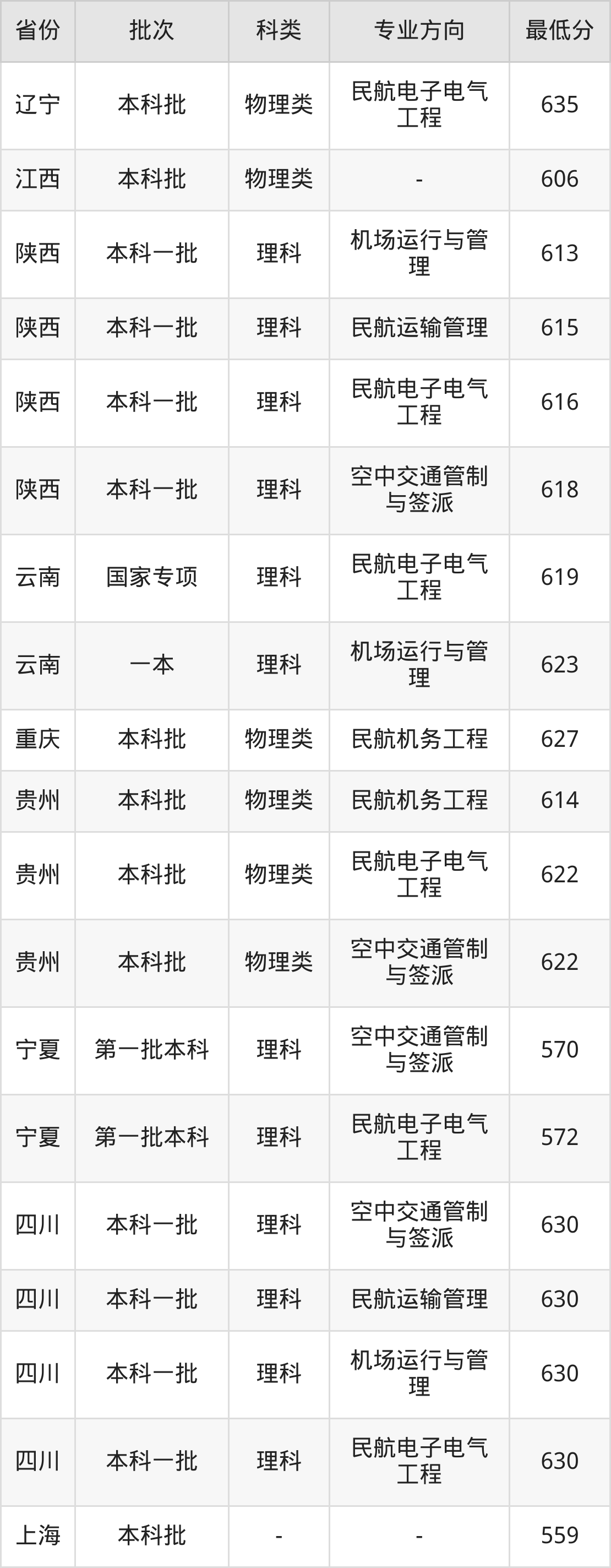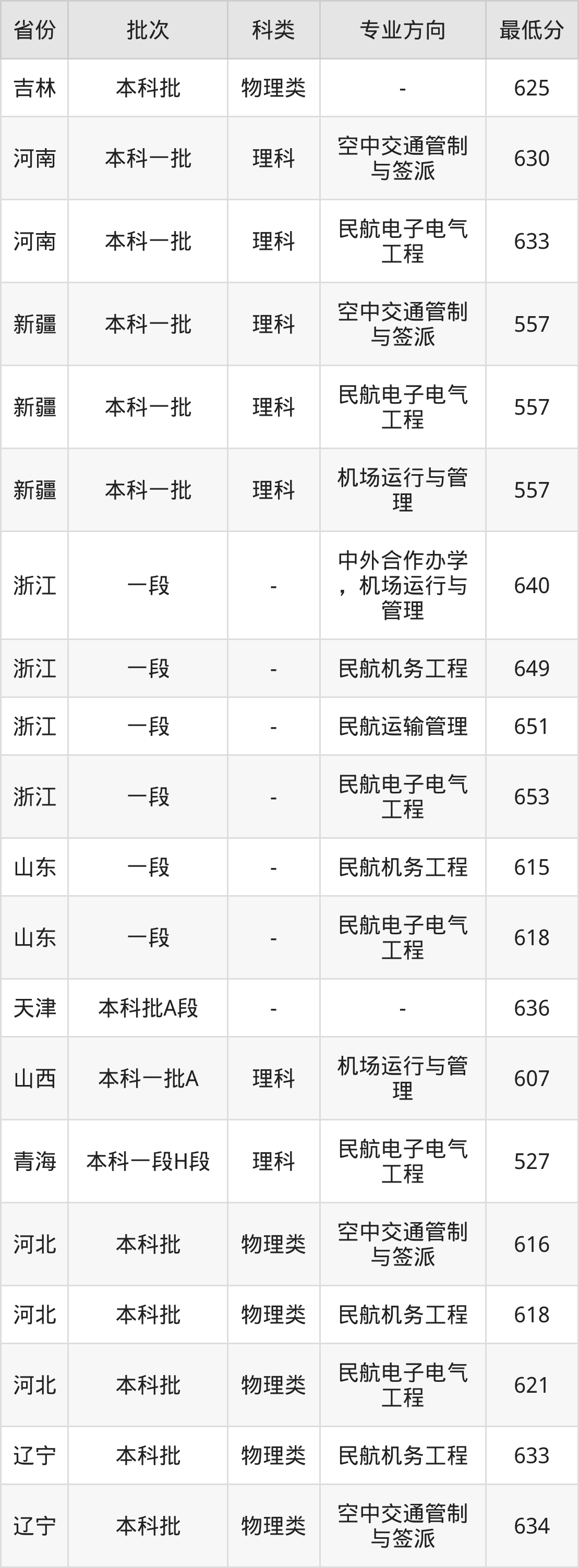 物理类633分(民航机务工程、位次6572名),物理类634分(空中交通管制与签派、位次6362名),物理类635分(民航电子电气工程、位次6184名);