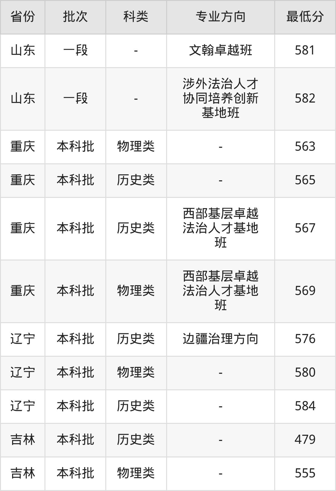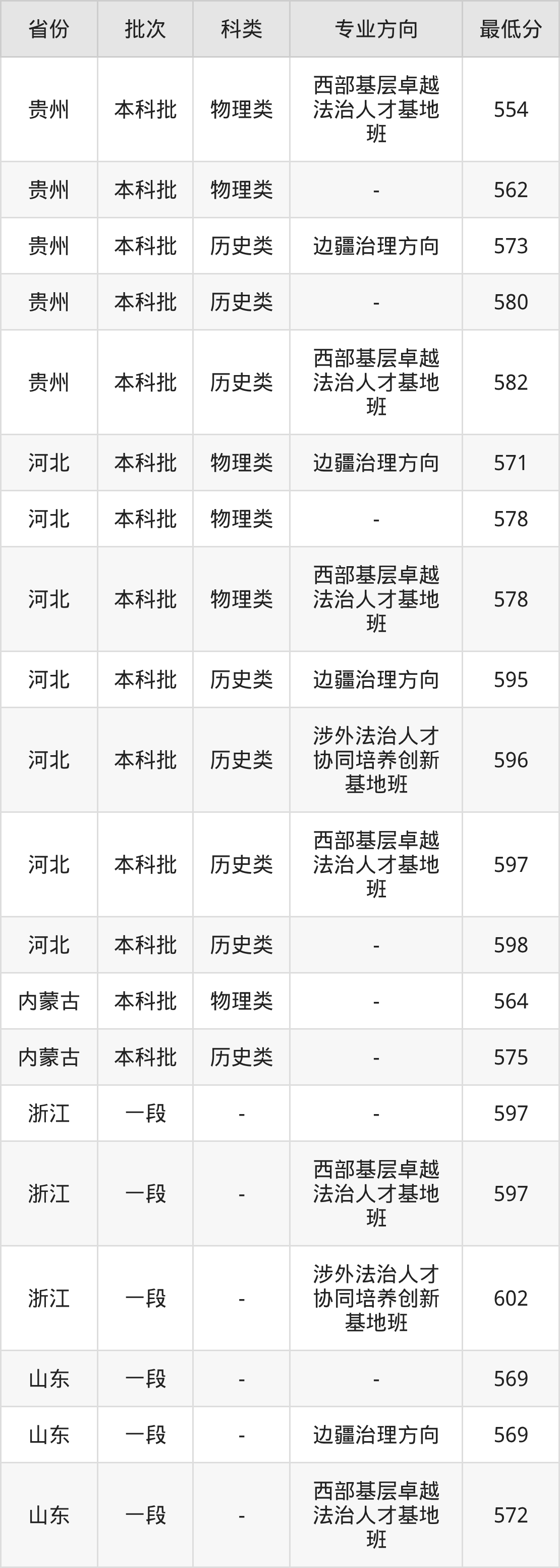 物理类554分(西部基层卓越法治人才基地班、位次21530名),物理类562分(位次18355名),历史类573分(边疆治理方向、位次4910名),历史类580分(位次4069名),历史类582分(西部基层卓越法治人才基地班、位次3879名);