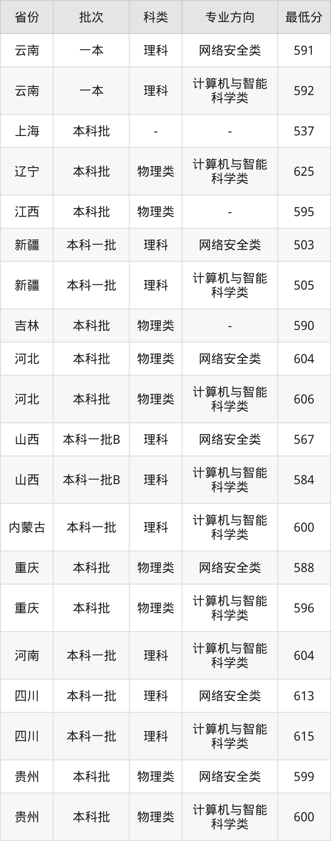 理科613分(网络安全类、位次18625名),理科615分(计算机与智能科学类、位次17563名);