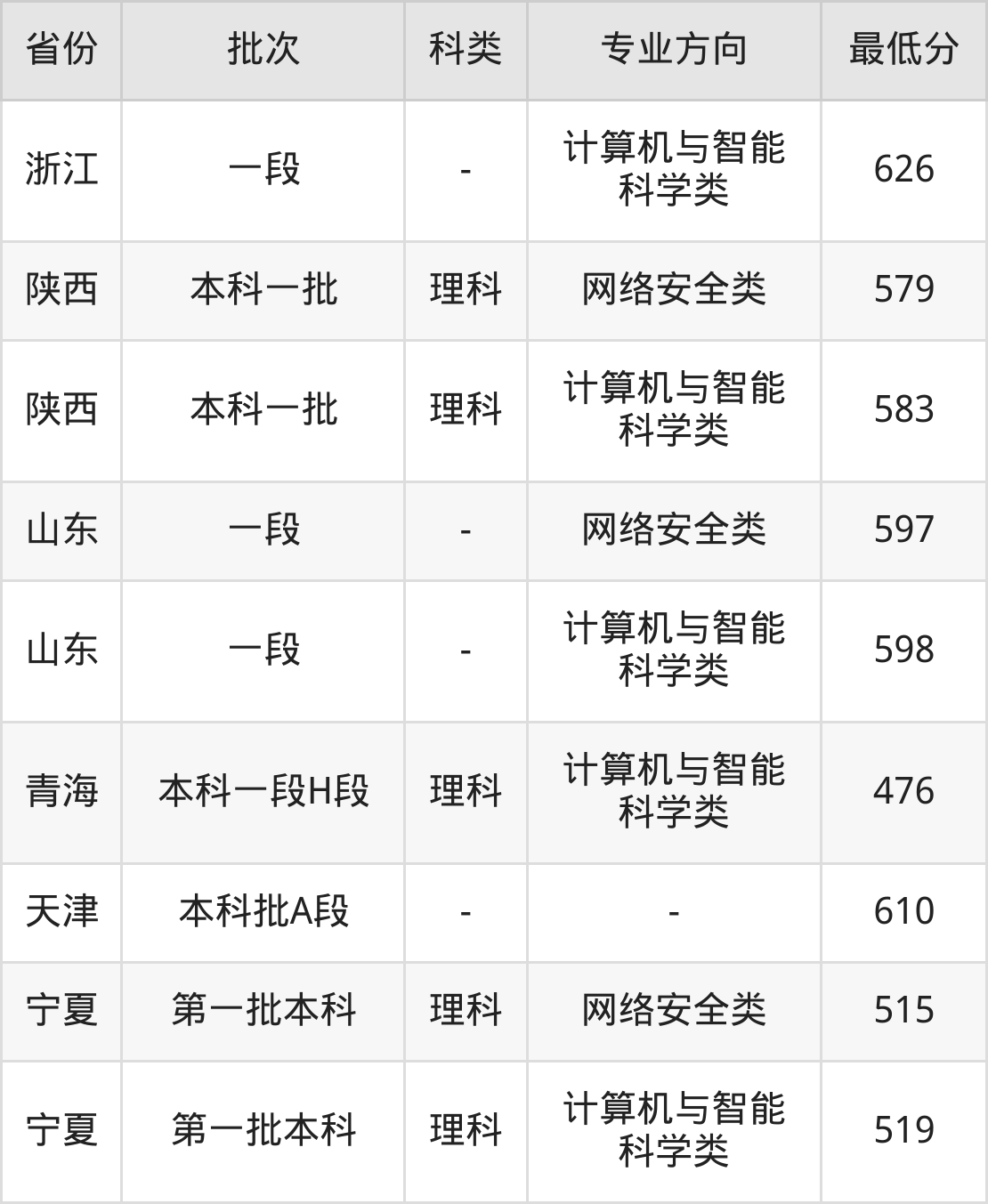 理科515分(网络安全类、位次3703名),理科519分(计算机与智能科学类、位次3415名);