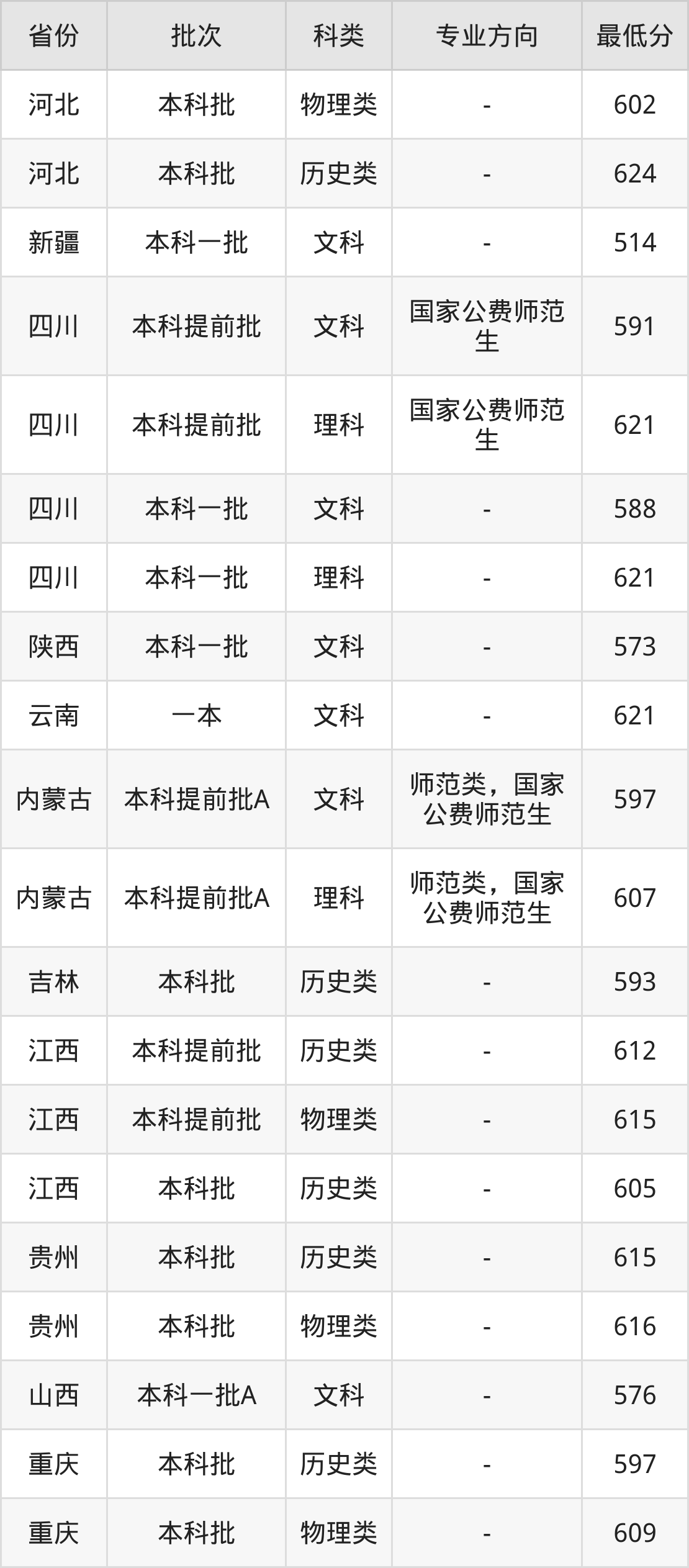 文科591分(国家公费师范生、位次2158名),理科621分(国家公费师范生、位次14632名),文科588分(位次2509名),理科621分(位次14632名);
