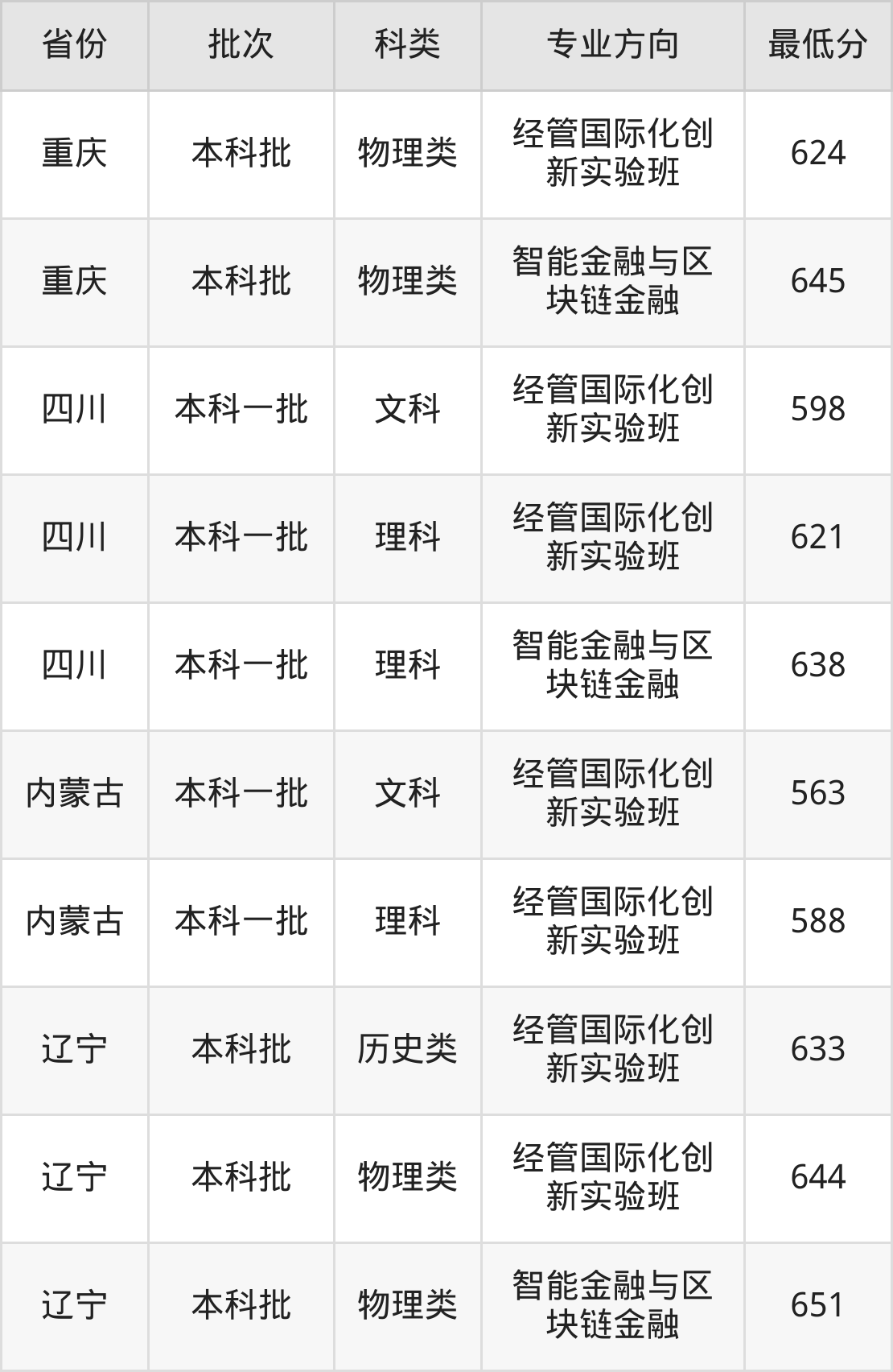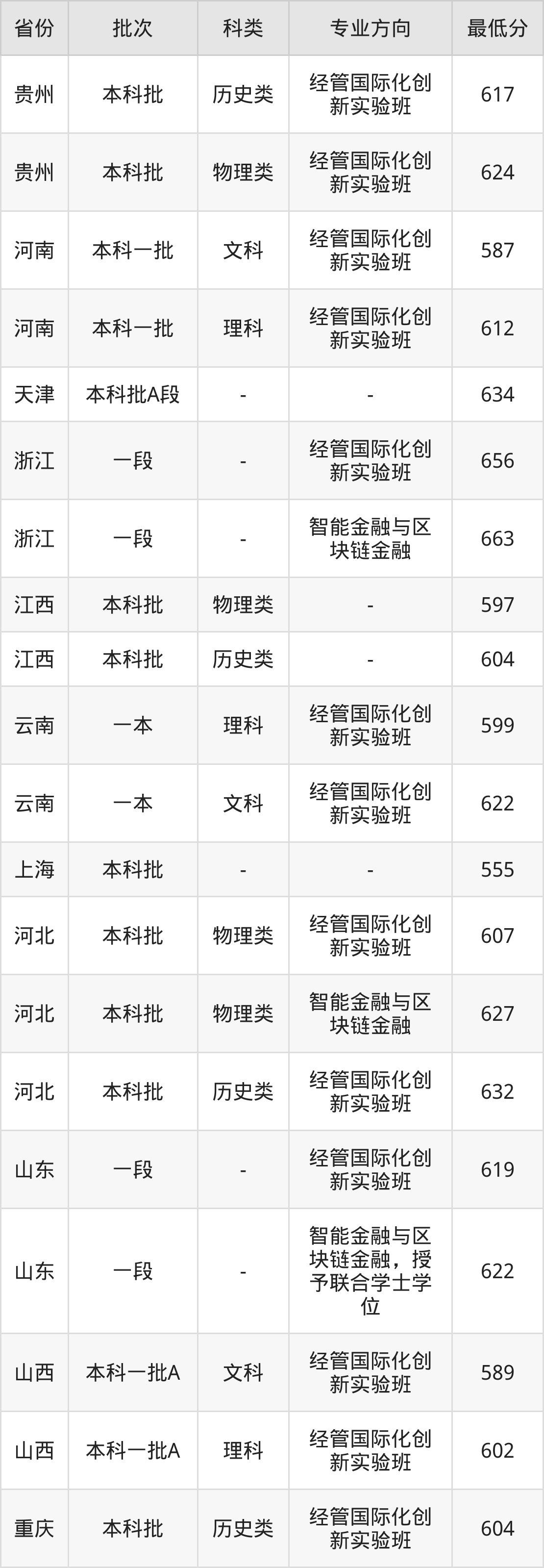历史类633分(经管国际化创新实验班、位次533名),物理类644分(经管国际化创新实验班、位次4535名),物理类651分(智能金融与区块链金融、位次3428名);