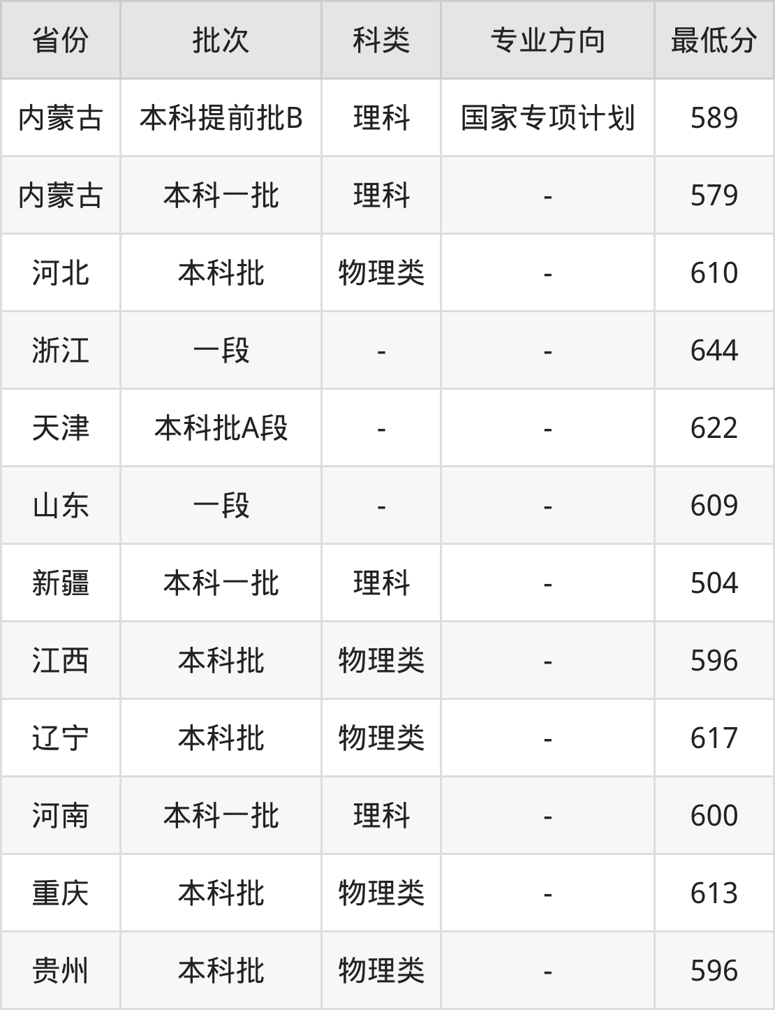 理科589分(国家专项计划、位次5371名),理科579分(位次6620名);