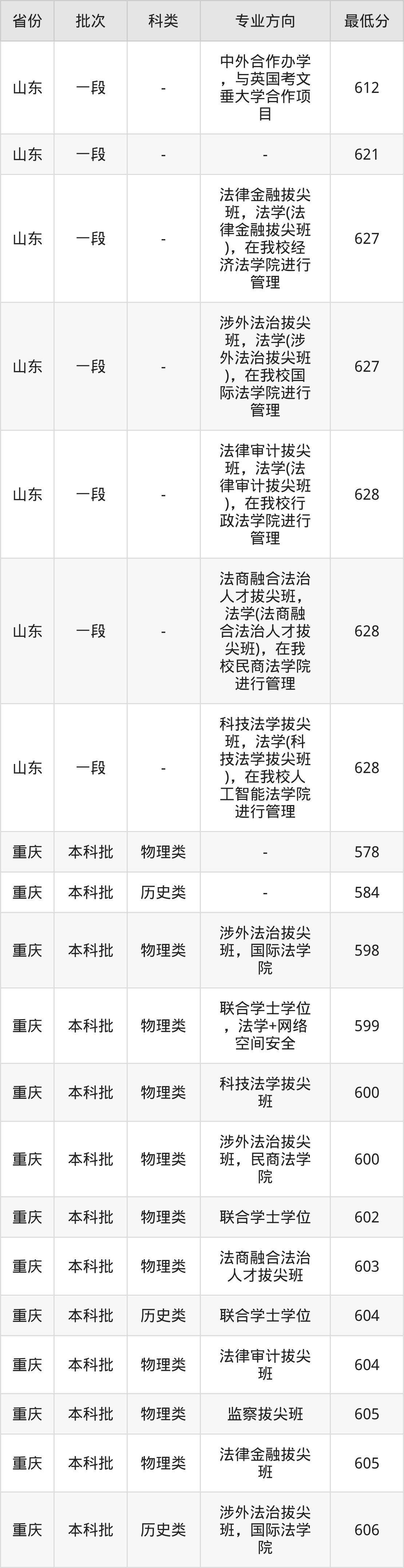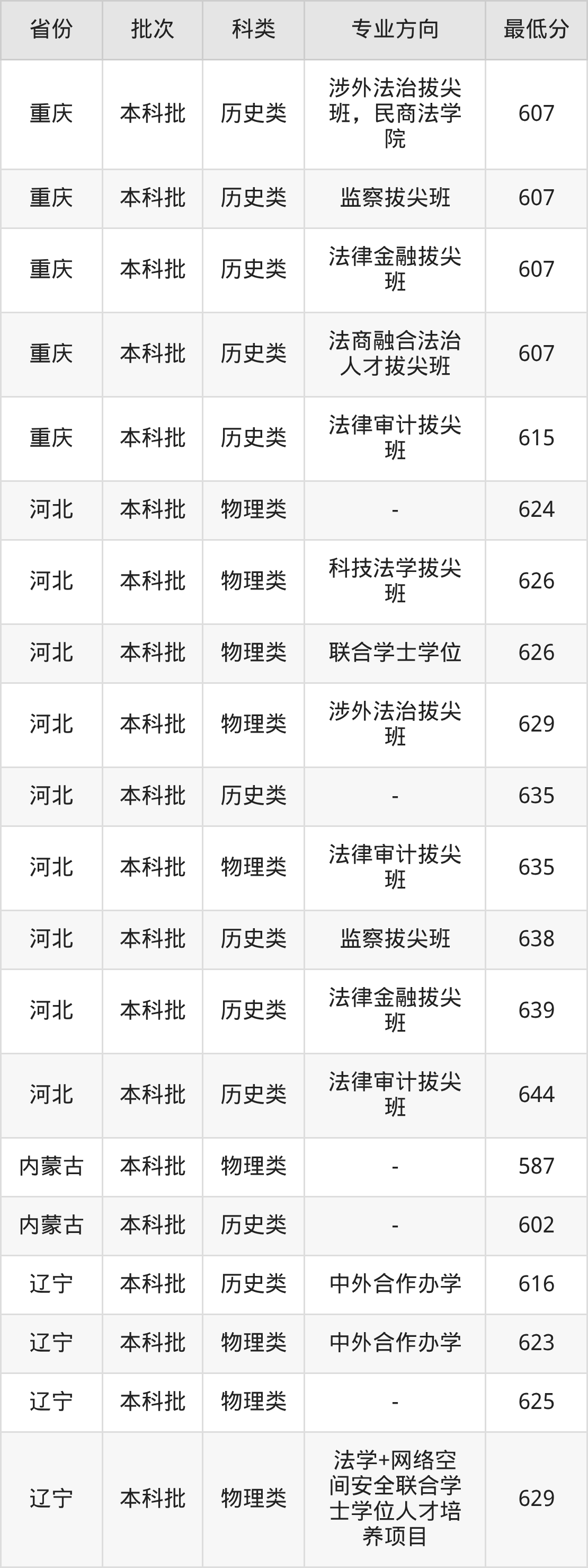 物理类624分(位次12091名),物理类626分(科技法学拔尖班、位次11148名),物理类626分(联合学士学位、位次11148名),物理类629分(涉外法治拔尖班、位次9827名),历史类635分(位次1125名),物理类635分(法律审计拔尖班、位次7522名),历史类638分(监察拔尖班、位次931名),历史类639分(法律金融拔尖班、位次876名),历史类644分(法律审计拔尖班、位次639名);