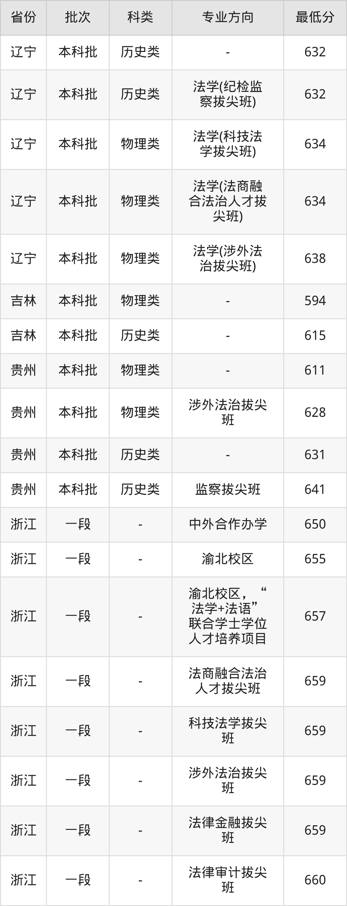 650分(中外合作办学、位次11242名),655分(渝北校区、位次9030名),657分(渝北校区,“法学+法语”联合学士学位人才培养项目、位次8049名),659分(法商融合法治人才拔尖班、位次7128名),659分(科技法学拔尖班、位次7136名),659分(涉外法治拔尖班、位次7173名),659分(法律金融拔尖班、位次7256名),660分(法律审计拔尖班、位次6917名);