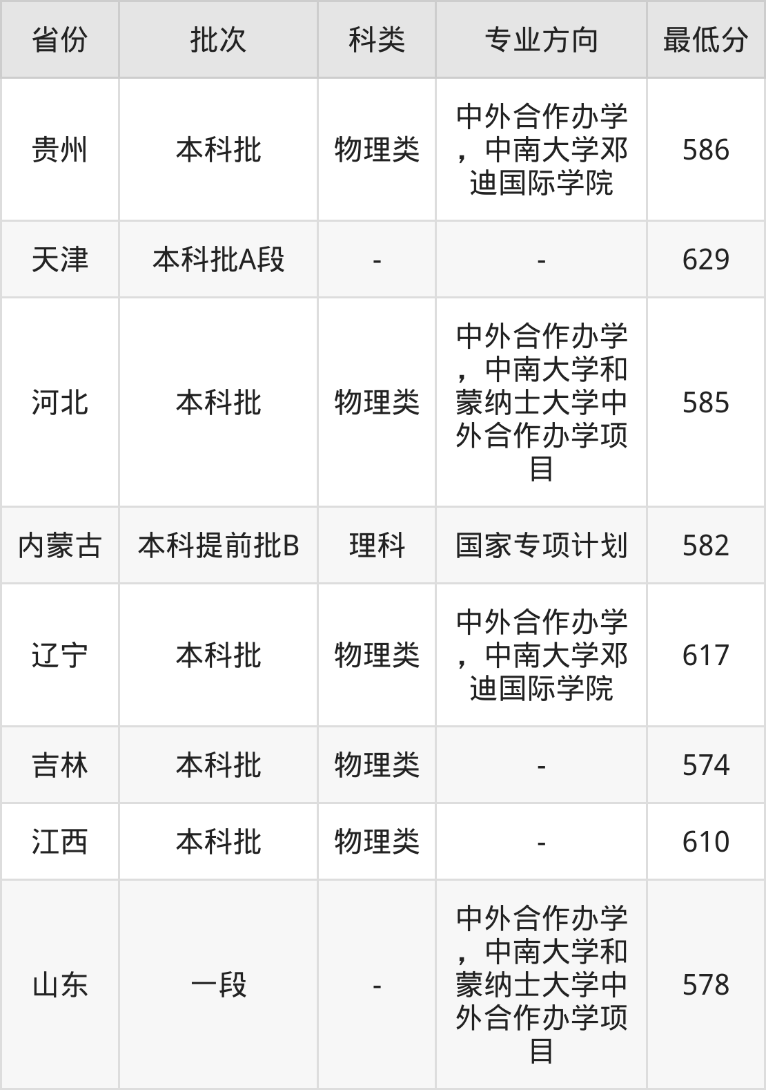 物理类585分(中外合作办学,中南大学和蒙纳士大学中外合作办学项目、位次25041名);