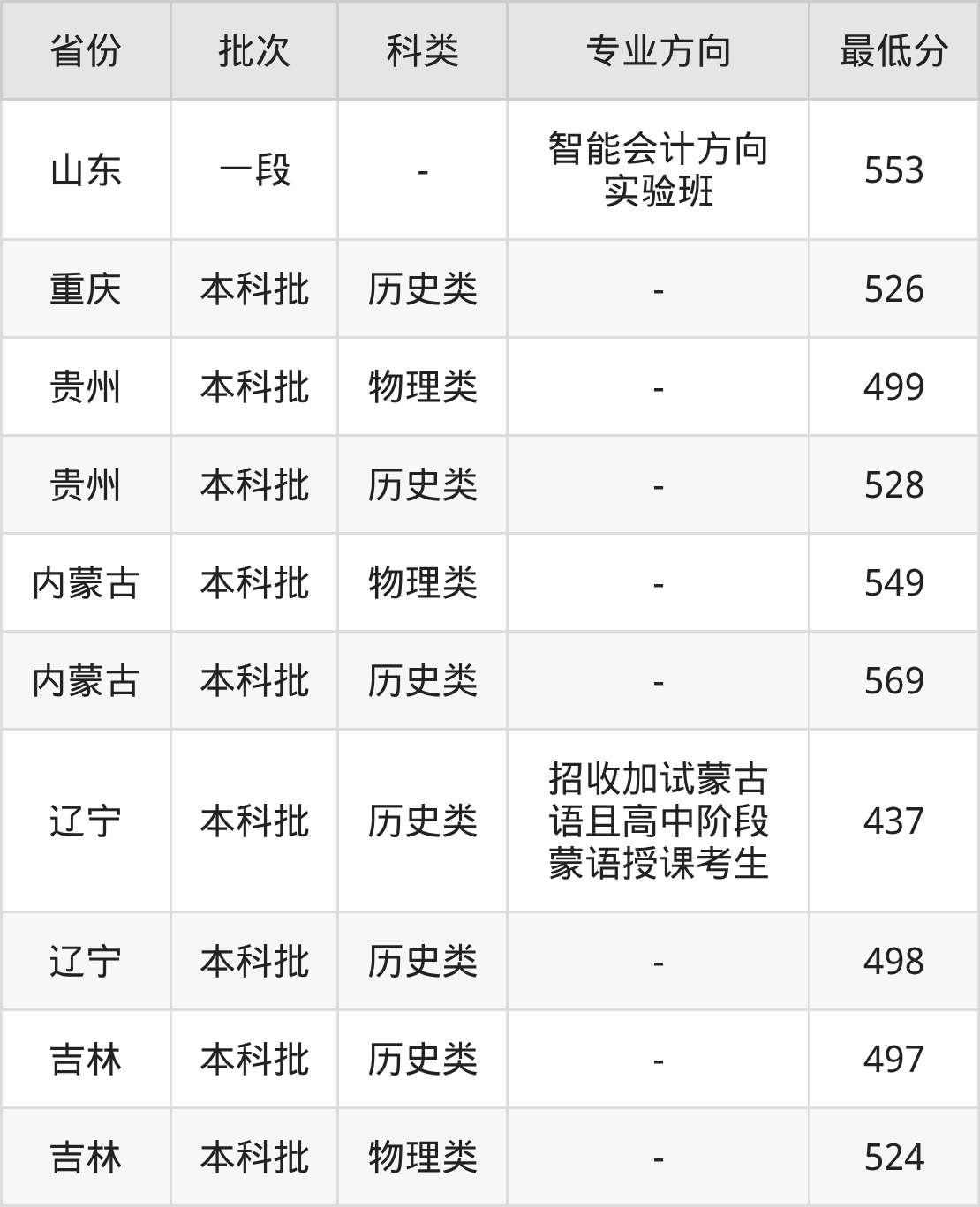 内蒙古财经大学会计学专业录取分数线2025各省汇总显示,自治区内招生最低分为549分,自治区外招生最低分为山东553分、重庆526分、贵州499分、辽宁437分等。更多专业分数详情、选科要求、专业简介等均可在正文查阅。