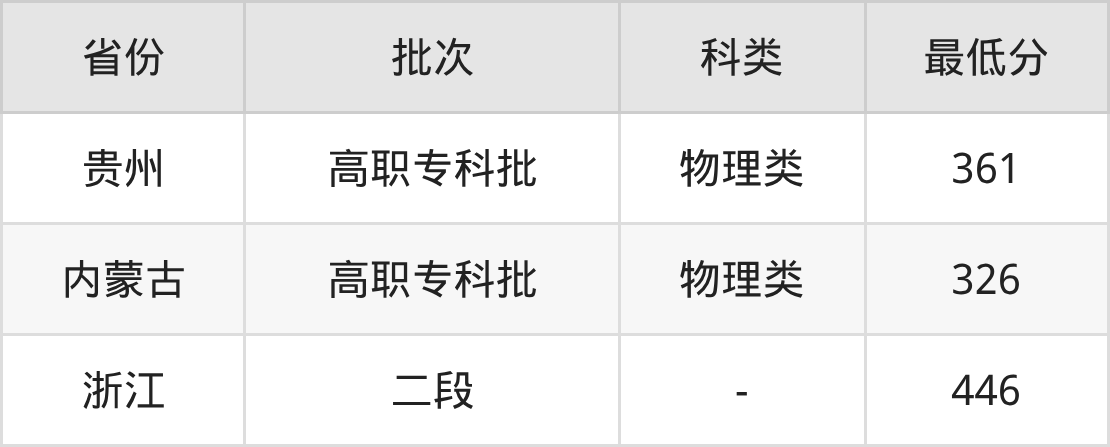 武汉工商学院电子信息工程技术专业录取分数线2025各省汇总显示,省外招生最低分为内蒙古326分、浙江446分、贵州361分。更多专业分数详情、选科要求、专业简介等均可在正文查阅。
