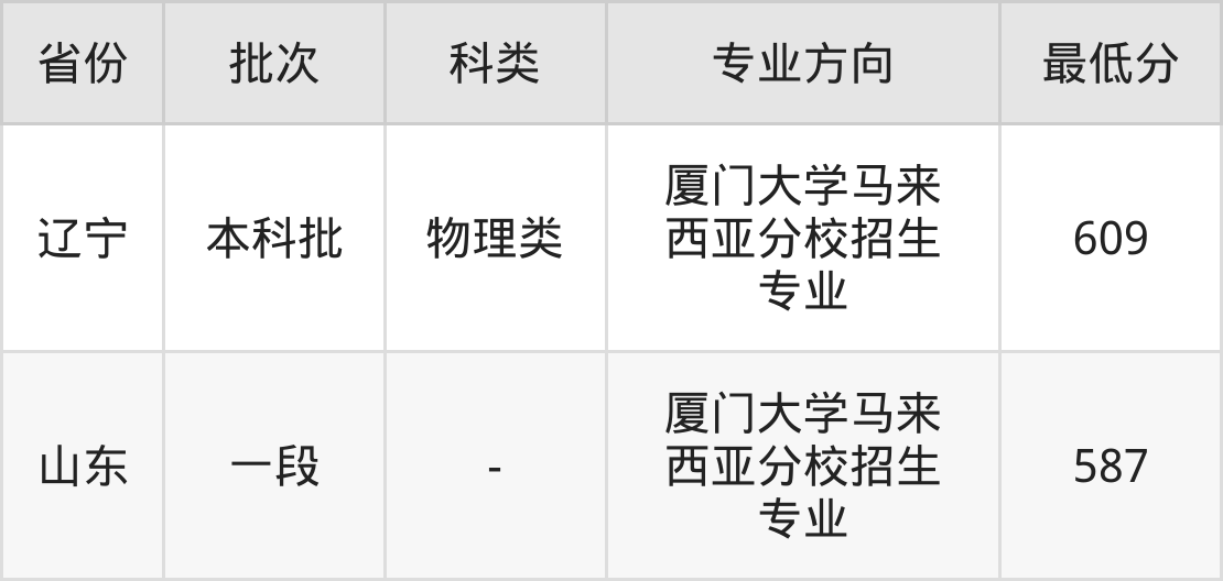 物理类609分(厦门大学马来西亚分校招生专业、位次12190名);