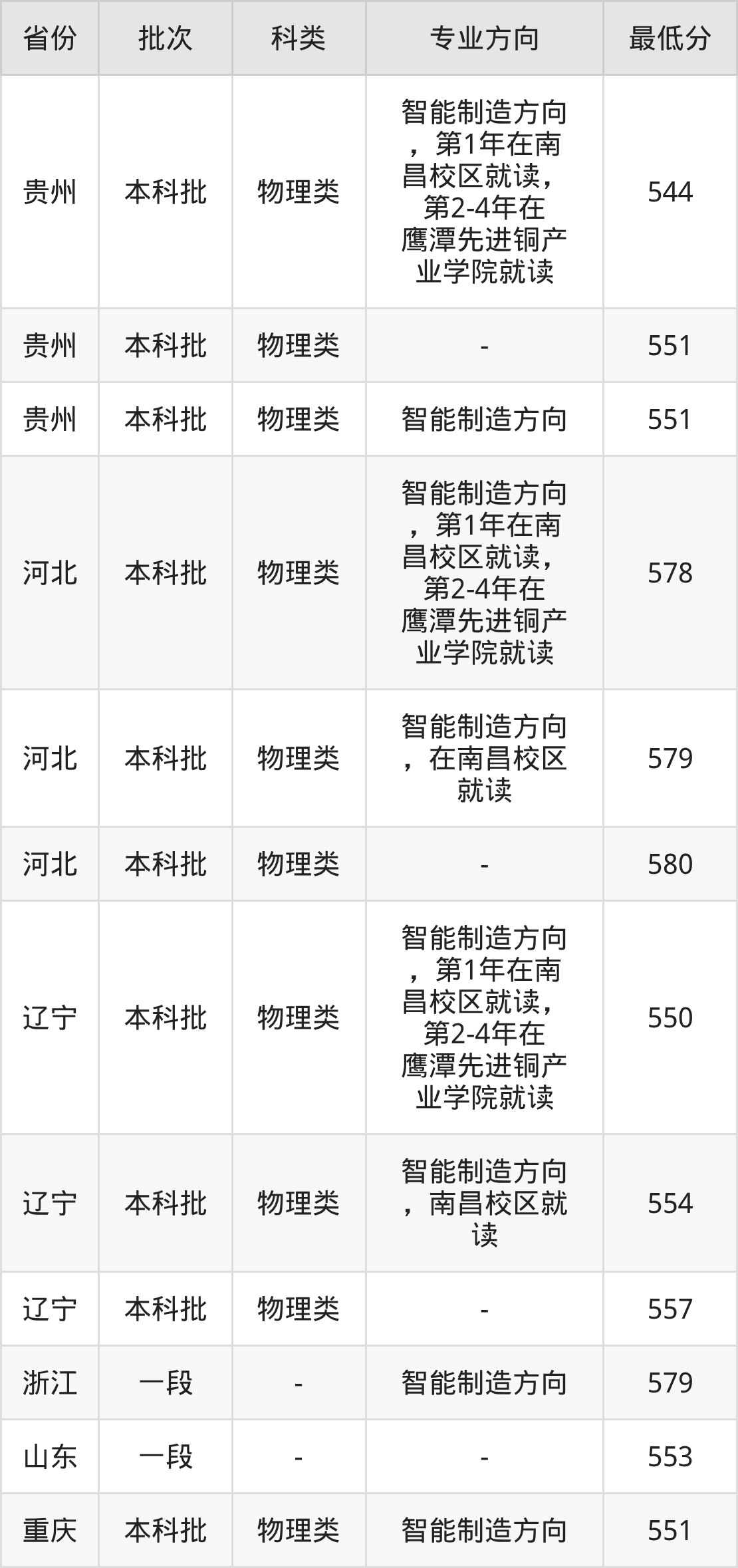 物理类544分(智能制造方向,第1年在南昌校区就读,第2-4年在鹰潭先进铜产业学院就读、位次25971名),物理类551分(位次22747名),物理类551分(智能制造方向、位次22885名);