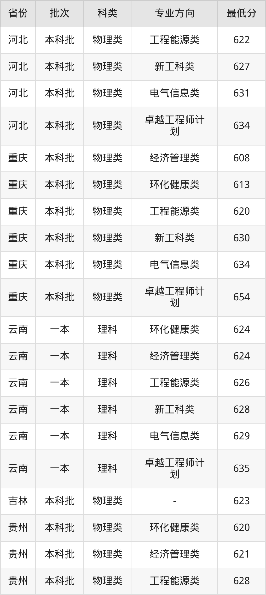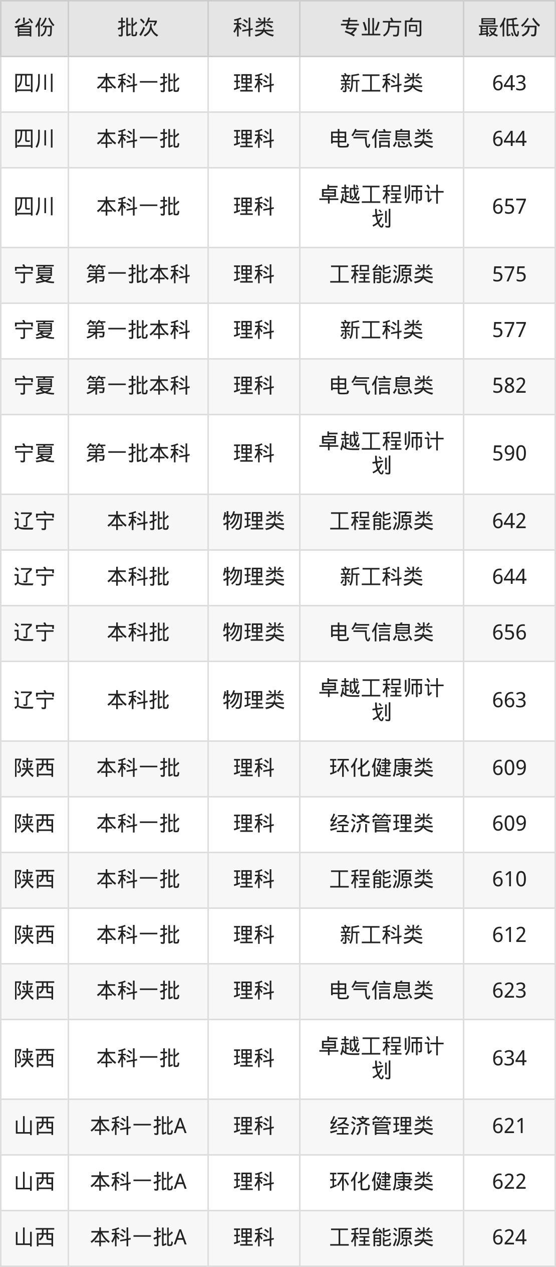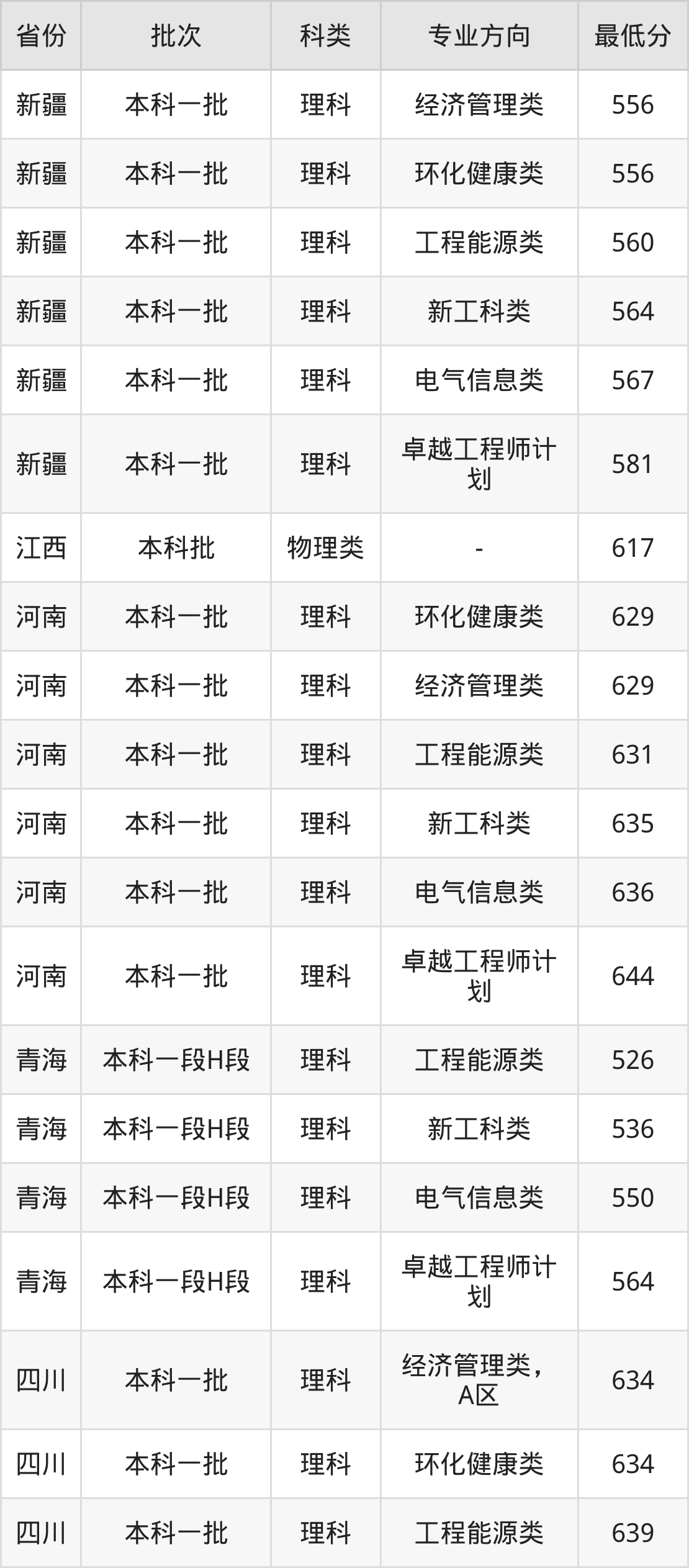 理科634分(经济管理类,A区、位次9316名),理科634分(环化健康类、位次9316名),理科639分(工程能源类、位次7684名),理科643分(新工科类、位次6530名),理科644分(电气信息类、位次6240名),理科657分(卓越工程师计划、位次3312名);