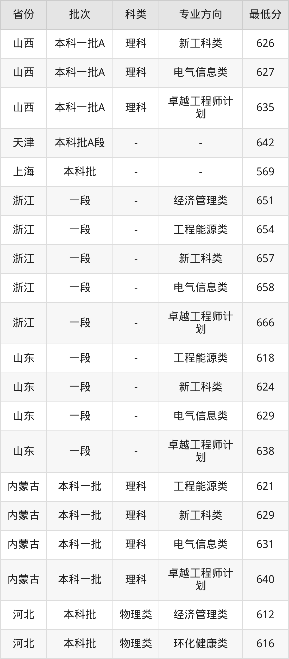 651分(经济管理类、位次12084名),654分(工程能源类、位次10440名),657分(新工科类、位次9202名),658分(电气信息类、位次8890名),666分(卓越工程师计划、位次5806名);