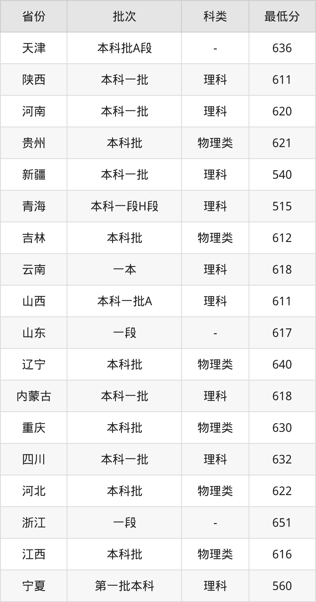 | 批次 | 科类 | 最低分 | 位次 |