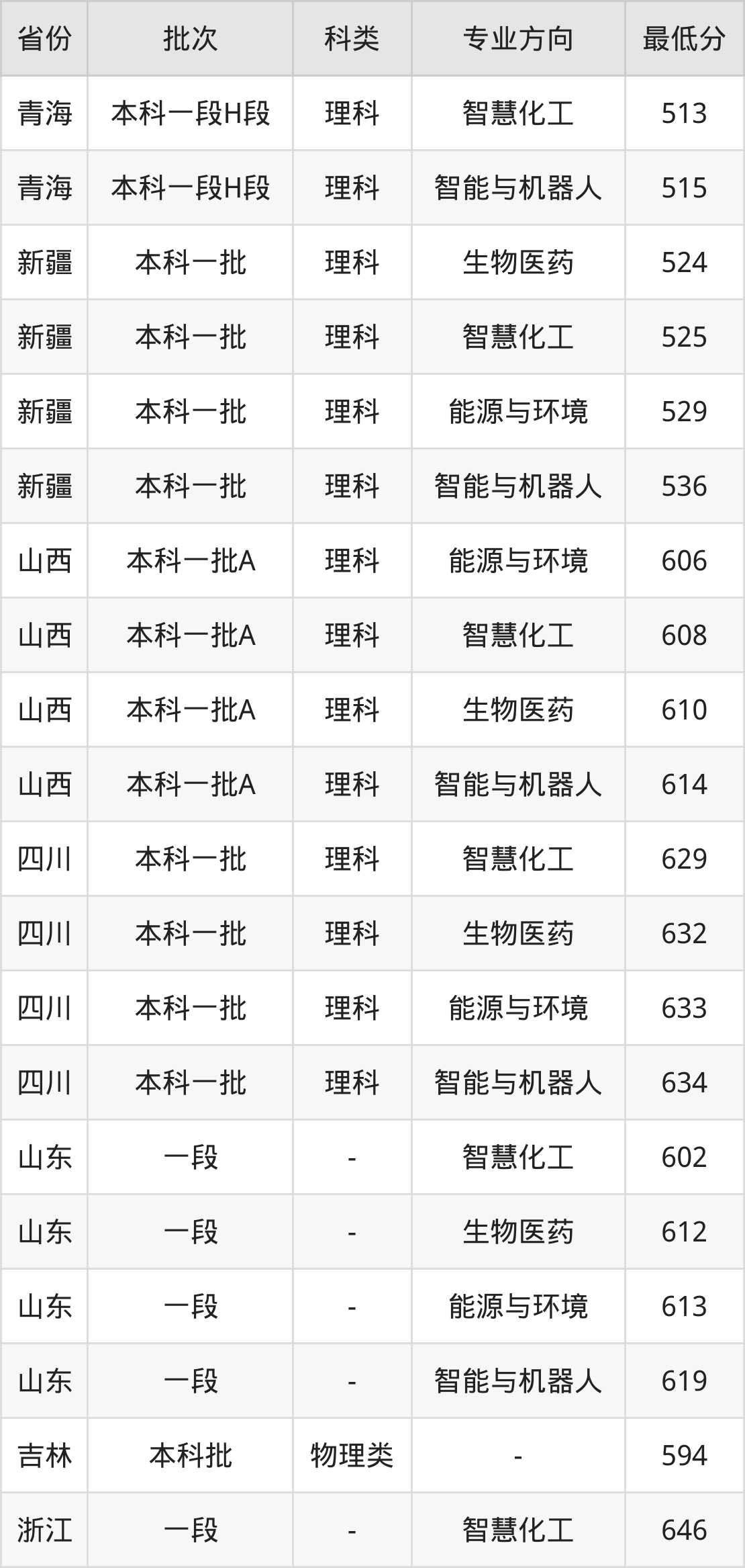 理科524分(生物医药、位次3503名),理科525分(智慧化工、位次3438名),理科529分(能源与环境、位次3216名),理科536分(智能与机器人、位次2832名);