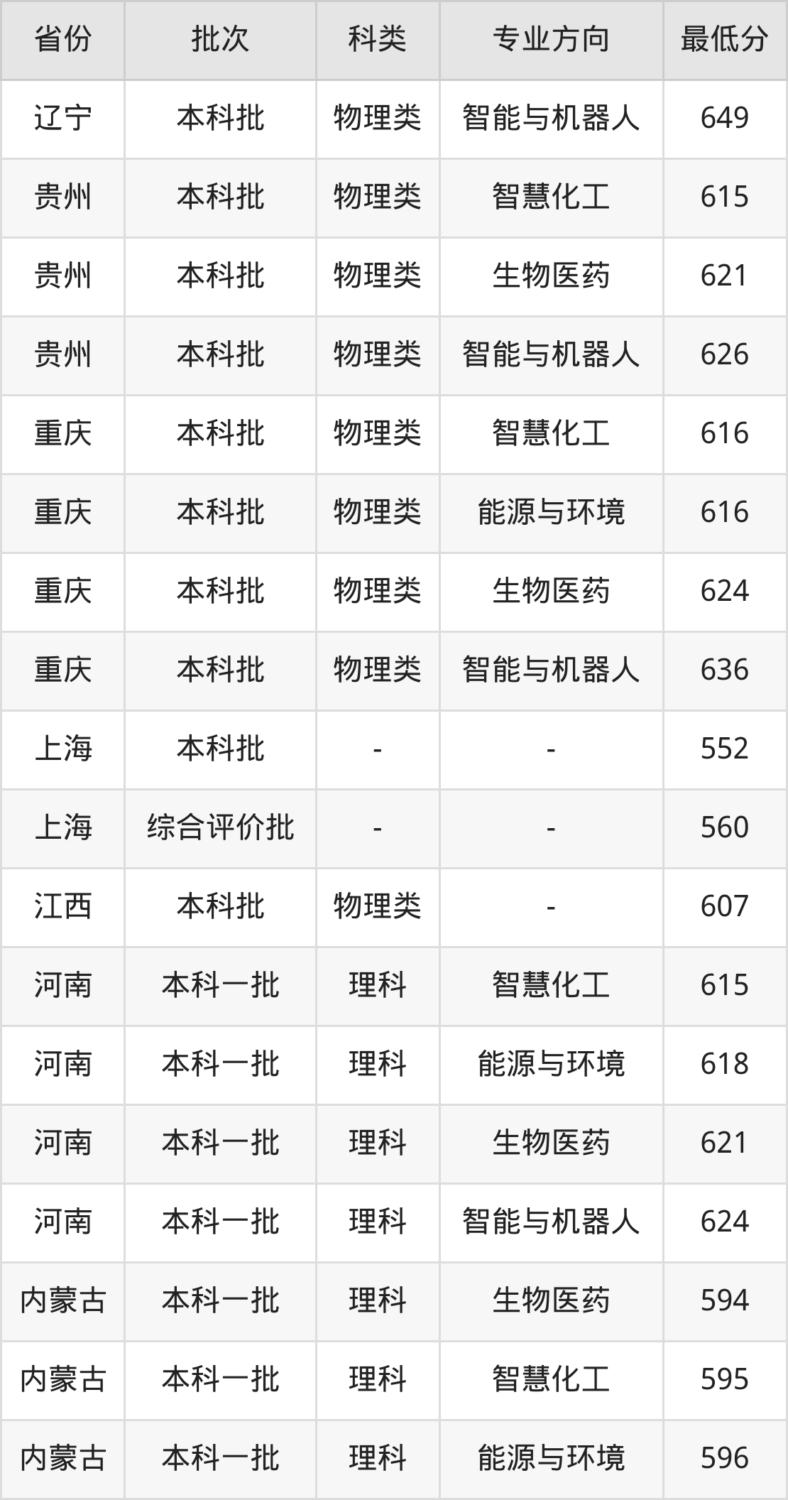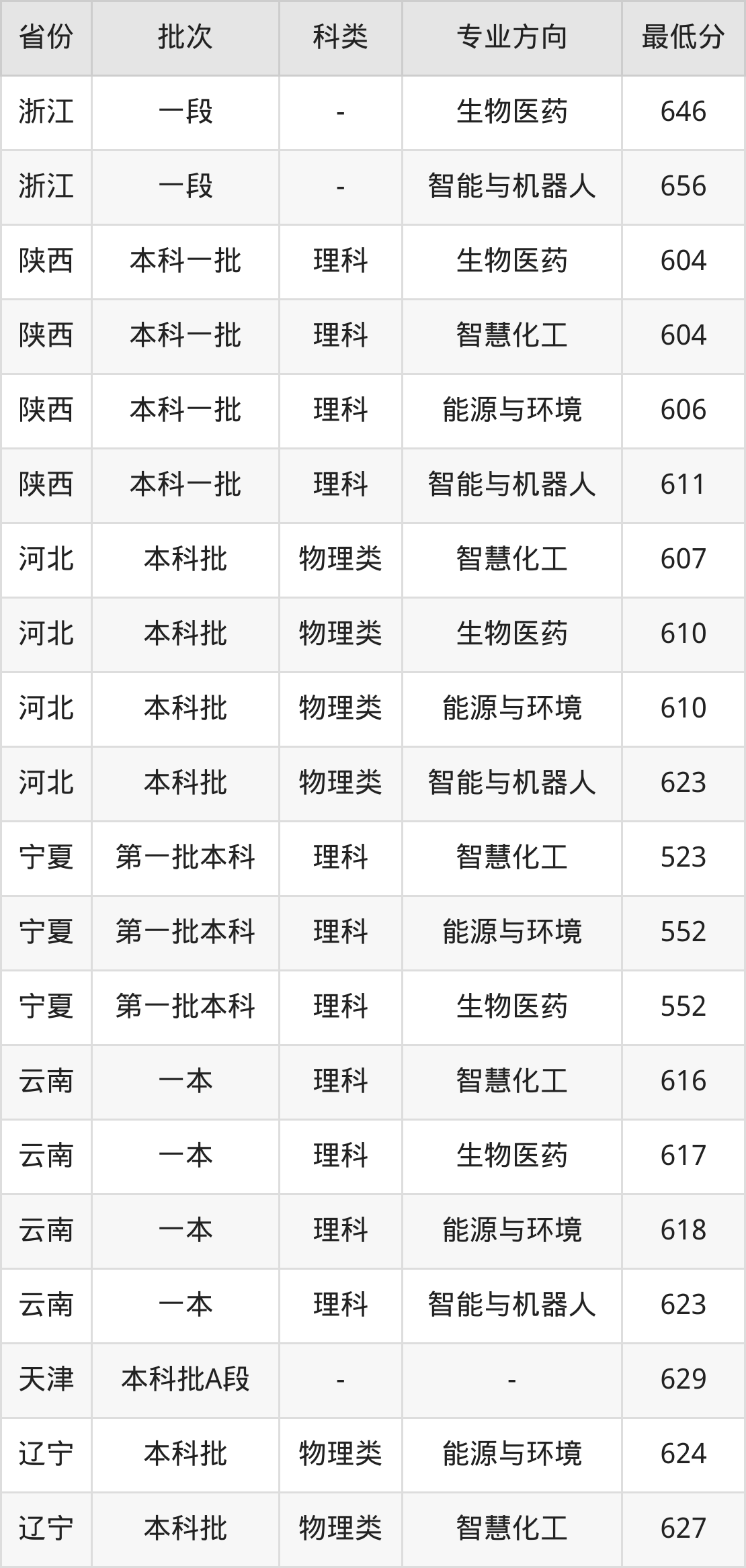 物理类607分(智慧化工、位次12449名),物理类610分(生物医药、位次11140名),物理类610分(能源与环境、位次11140名),物理类623分(智能与机器人、位次6477名);