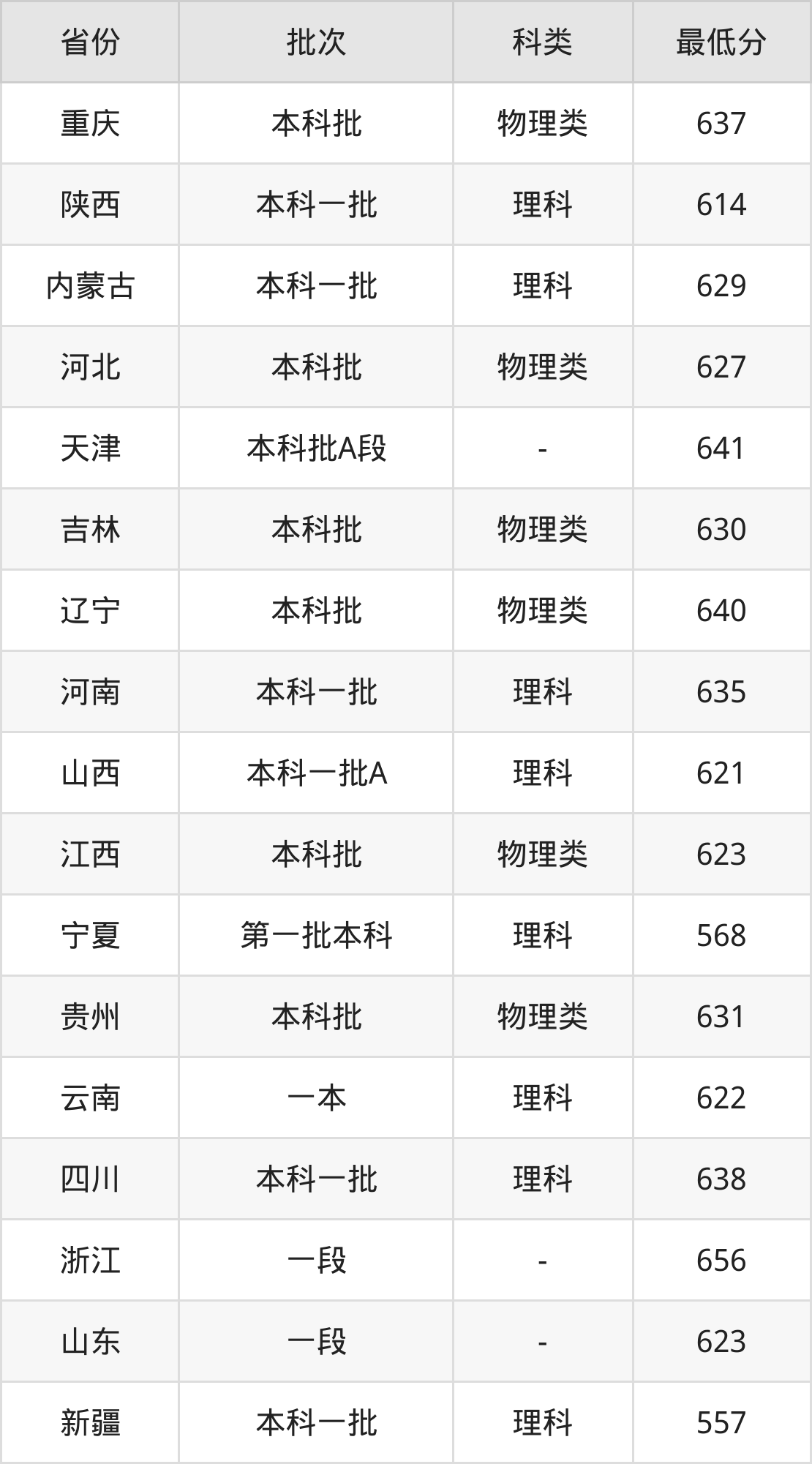 | 批次 | 科类 | 最低分 | 位次 |