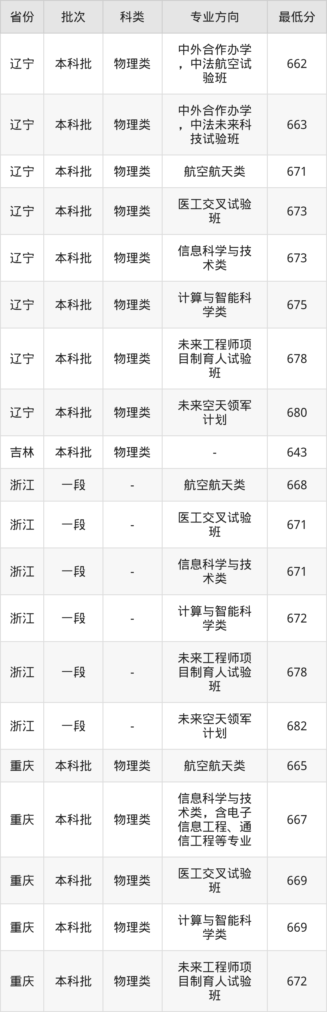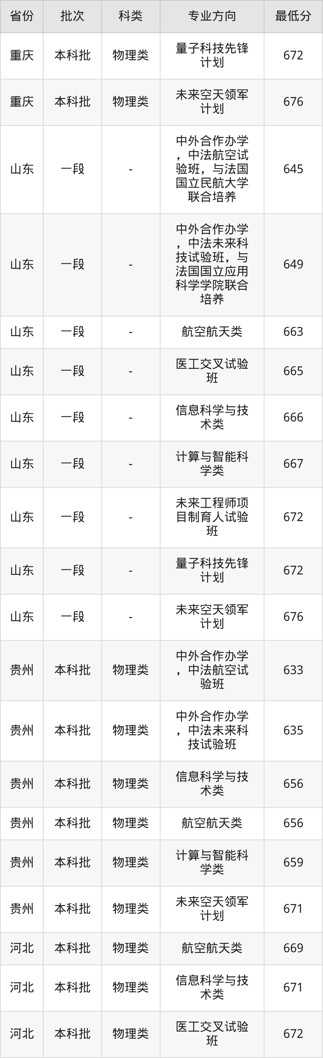645分(中外合作办学,中法航空试验班,与法国国立民航大学联合培养、位次4602名),649分(中外合作办学,中法未来科技试验班,与法国国立应用科学学院联合培养、位次3673名),663分(航空航天类、位次1512名),665分(医工交叉试验班、位次1354名),666分(信息科学与技术类、位次1208名),667分(计算与智能科学类、位次1128名),672分(未来工程师项目制育人试验班、位次673名),672分(量子科技先锋计划、位次691名),676分(未来空天领军计划、位次452名);