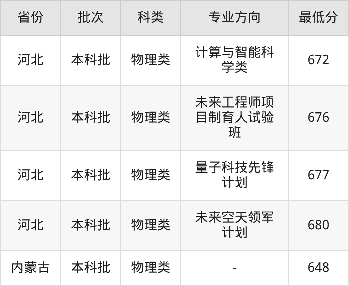 物理类669分(航空航天类、位次788名),物理类671分(信息科学与技术类、位次681名),物理类672分(医工交叉试验班、位次622名),物理类672分(计算与智能科学类、位次622名),物理类676分(未来工程师项目制育人试验班、位次395名),物理类677分(量子科技先锋计划、位次361名),物理类680分(未来空天领军计划、位次267名);