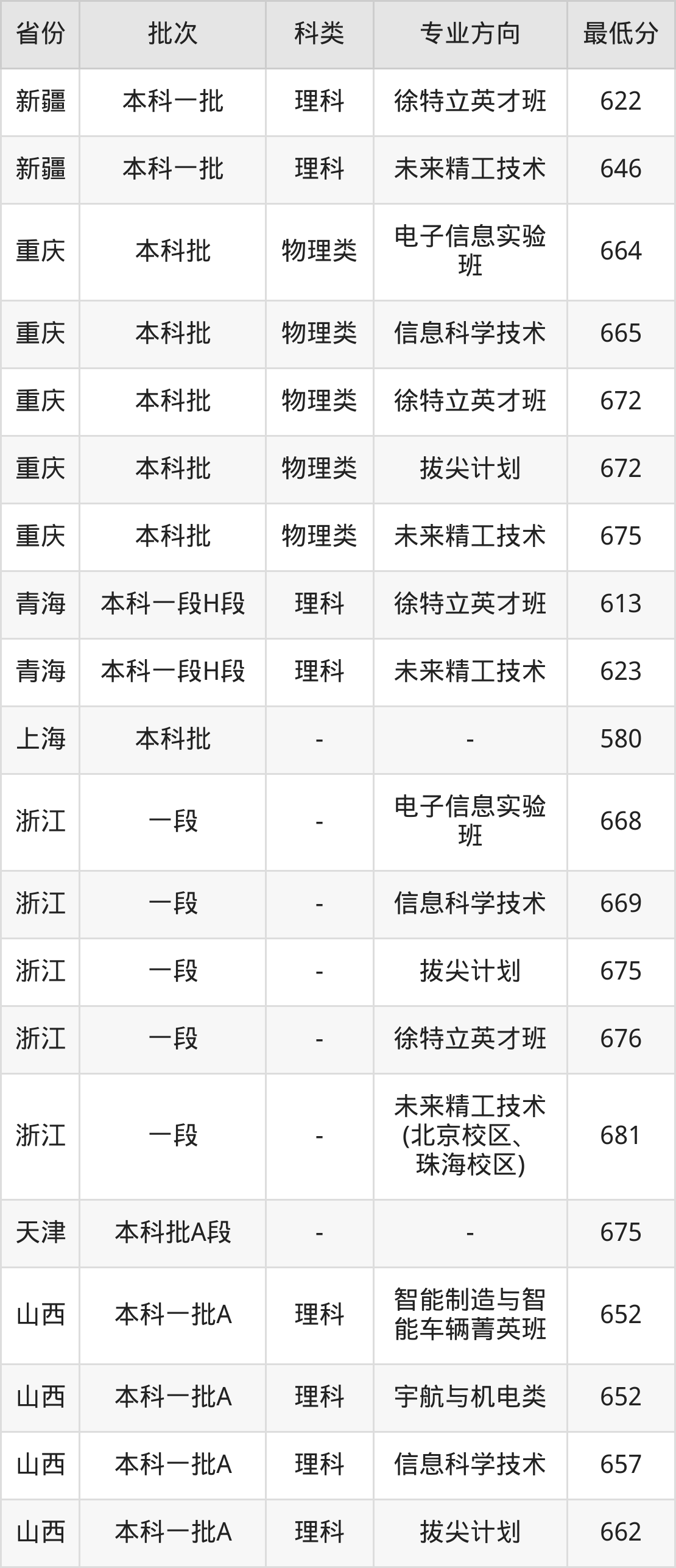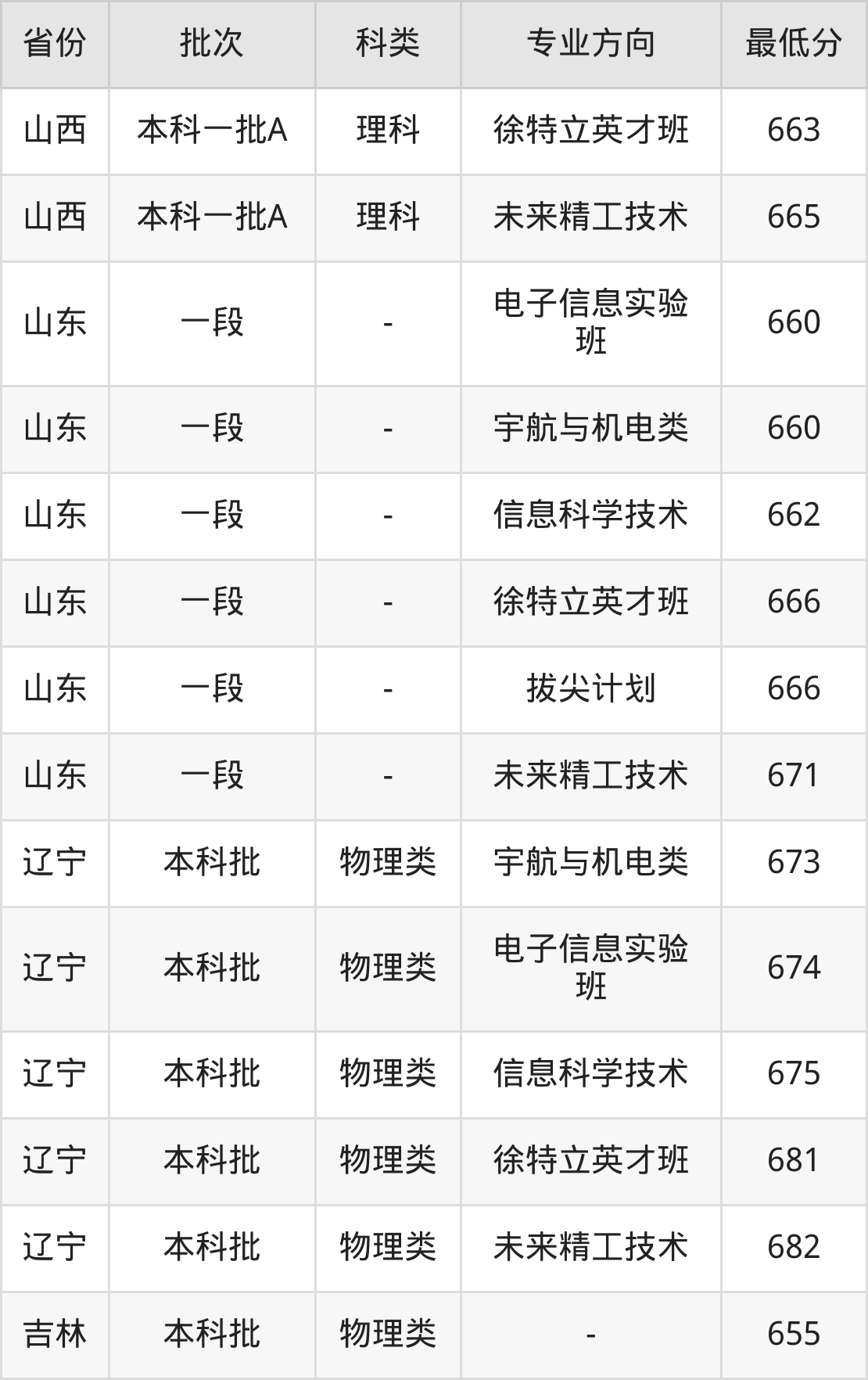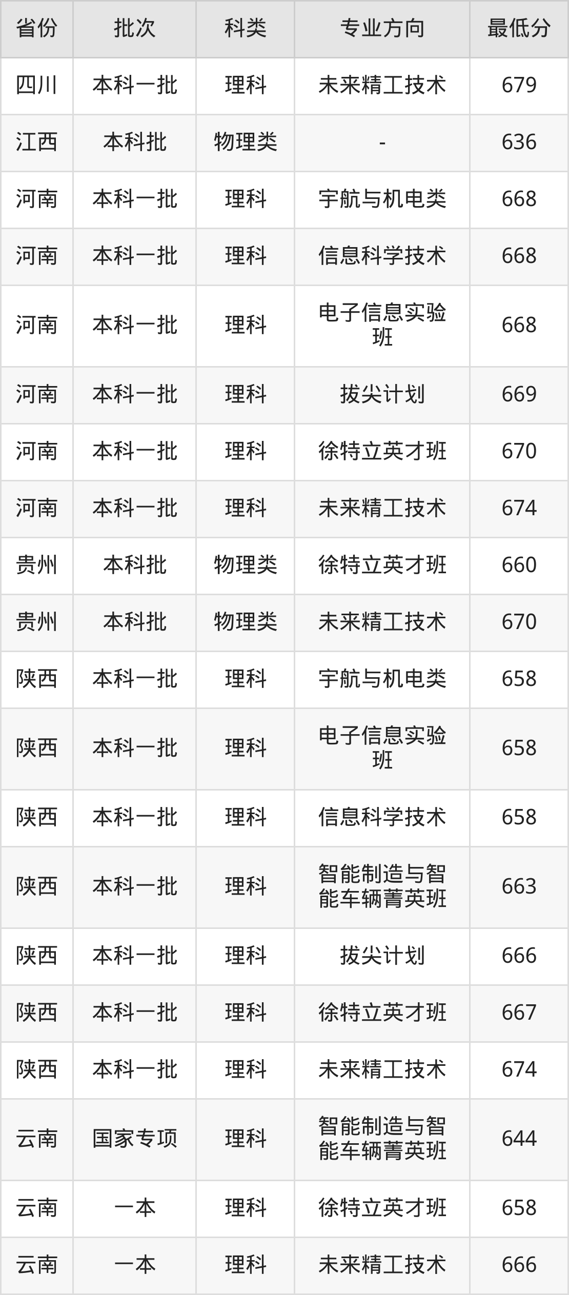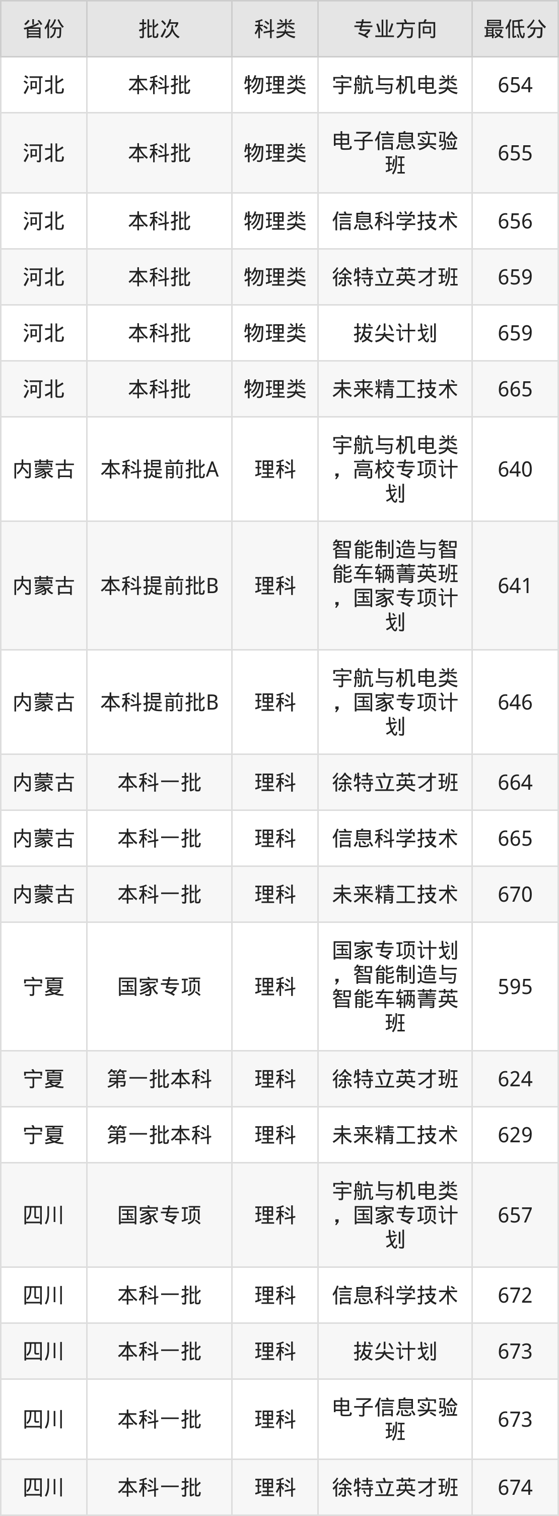 理科652分(智能制造与智能车辆菁英班、位次1132名),理科652分(宇航与机电类、位次1132名),理科657分(信息科学技术、位次872名),理科662分(拔尖计划、位次654名),理科663分(徐特立英才班、位次618名),理科665分(未来精工技术、位次535名);